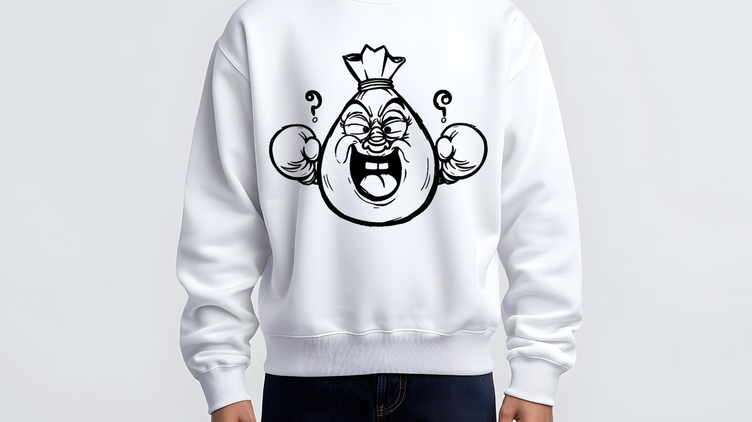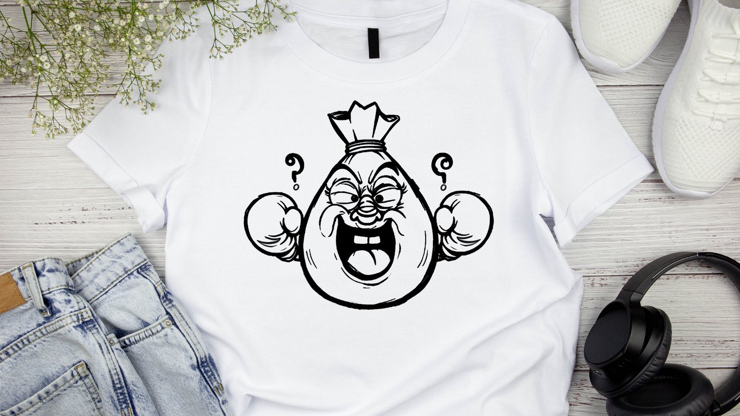 Bring bold energy and humor to your projects with this cartoon-style money bag wearing boxing gloves, sporting a fierce folded face ready to throw a punch! Perfect for T-shirts, hoodies, mugs, posters, stickers, and digital art projects, this playful design adds attitude and personality to any creation.
