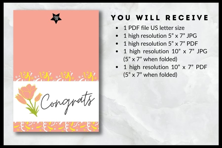 Images displayed are for idea only. This CONGRATULATIONS CARD is an INSTANT DIGITAL DOWNLOAD - No physical product will be shipped . Once your payment is processed the digital files will be available for download immediately.