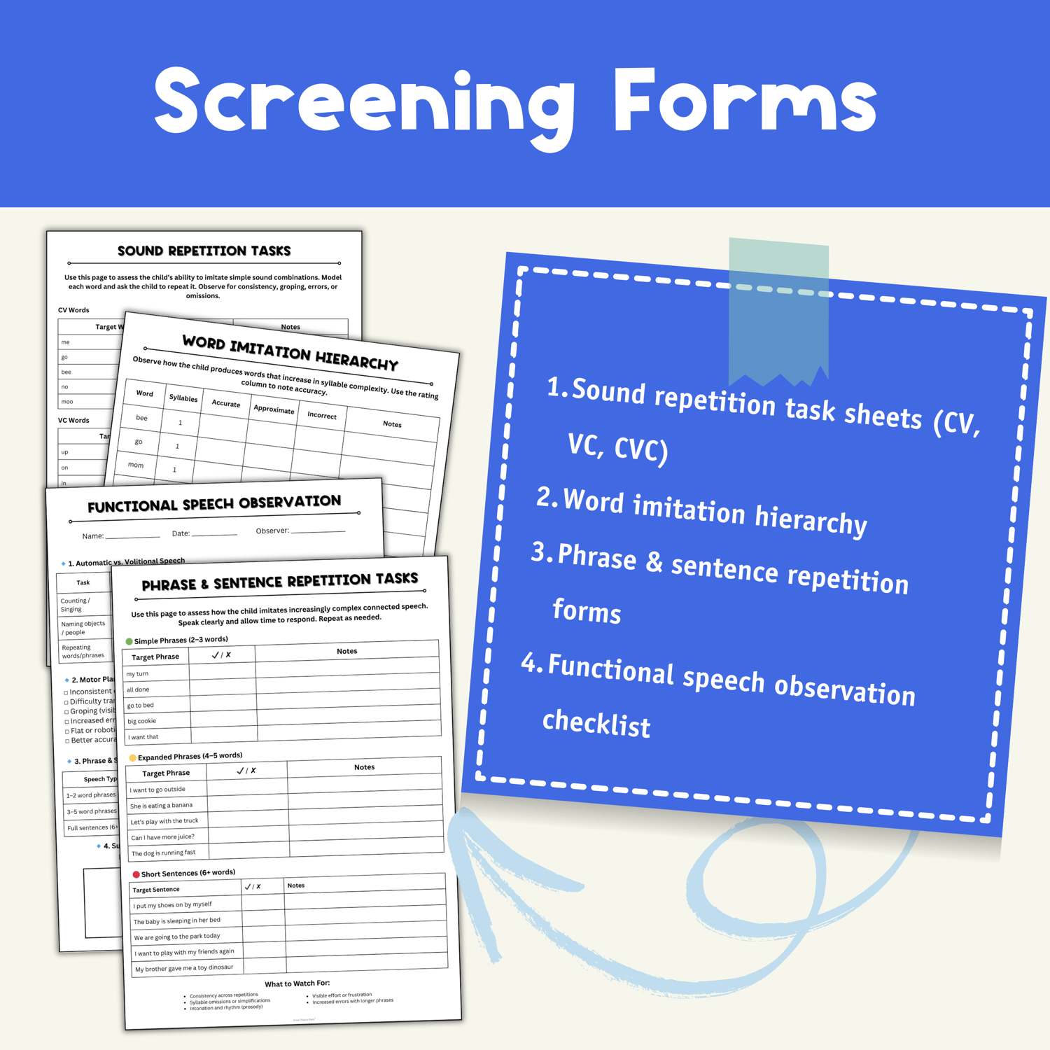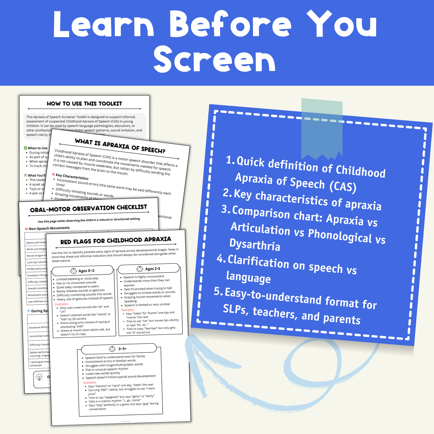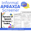 This toolkit helps SLPs, teachers, and support staff screen for apraxia in a professional, supportive, and developmentally appropriate way. It includes informative pages, screening forms, checklists, and visual supports to help guide early identification and communication with families.