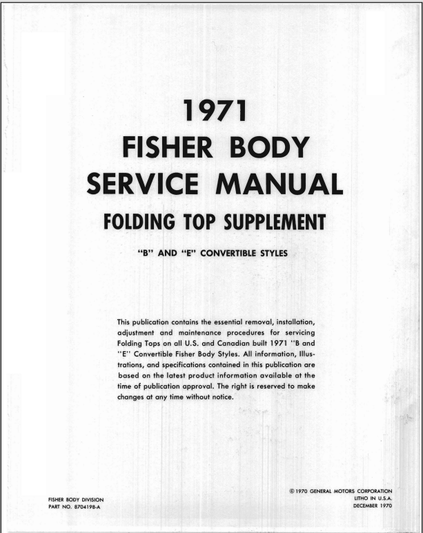1971 Fisher Body Folding Top Service Manual Supplement Part No. 8704198-A