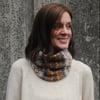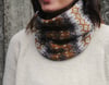 The wearer is 5’10” / 178 cm with a 37” / 92.5 cm chest circumference. The tubular cowl sample has been worked in size Adult 1. The cowl sample has been worked in size Adult 2.