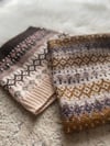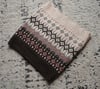 The cowl is worked bottom up, in the round. Stitches are cast on for the neckhole circumference and a section of half-twisted ribbing is worked initially. Once complete, stranded colourwork is worked with four colours (although only two colours are used on any given round). Another section of half-twisted ribbing is worked to complete the top of the cowl.