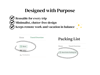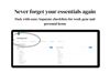 Packing List - Organized into work essentials (tech gadgets) and personal items