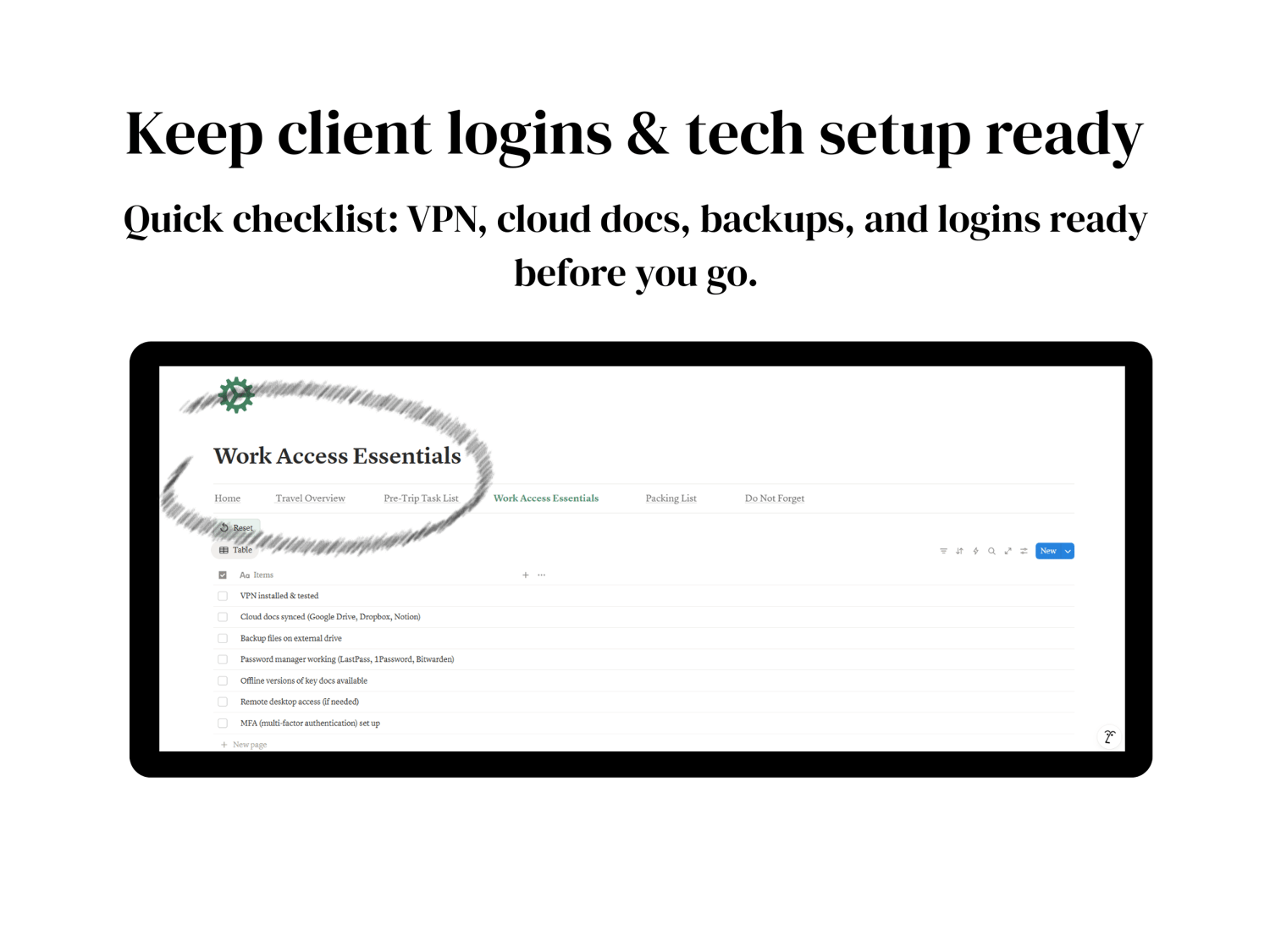 Access Setup - VPN, cloud docs, passwords, and backup systems so you never get locked out while abroad.