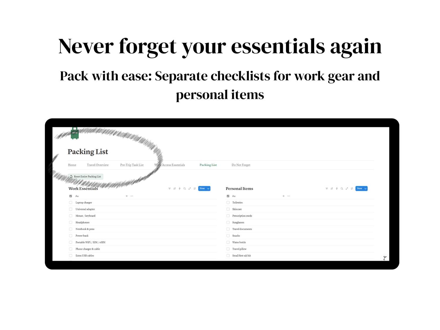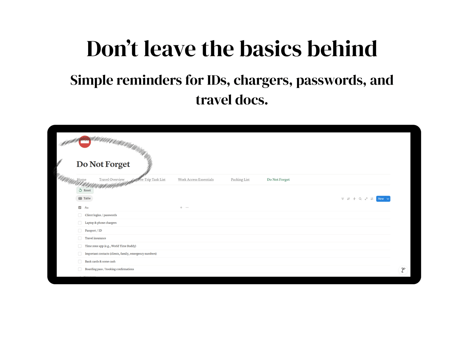 Do Not Forget List - Passport, chargers, client logins, emergency contacts, and more.