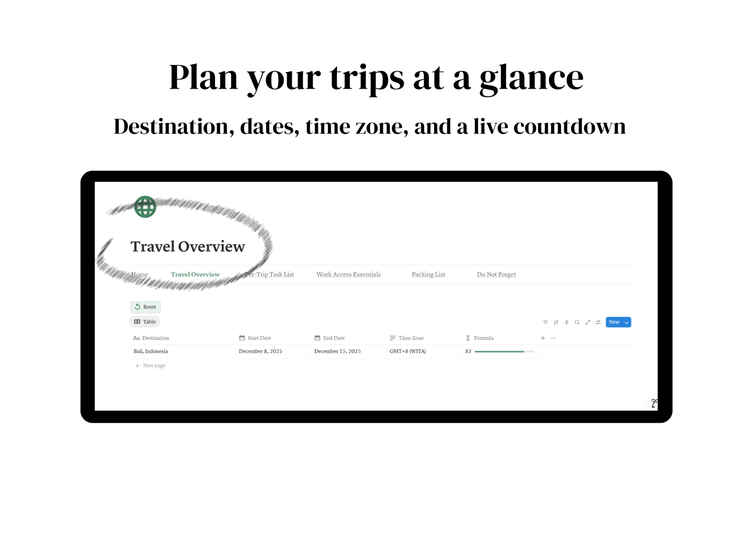 Travel Overview - Destination, dates, countdown, and time zone in one glance.