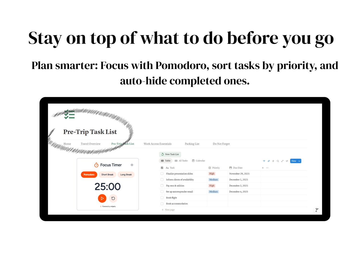 The Workcation Planner is your all-in-one Notion dashboard designed for freelancers, virtual assistants, and remote workers who want to balance getting things done with enjoying their getaway.