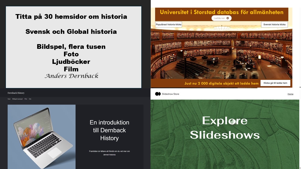 30 hemsidor att utforska. Svensk och Global historia. Ett bildspelsmuseum. Ett digitalt bibliotek med 550 miljoner sökbara objekt. Swedish history. Slideshow Store about 3 000 slideshows to download.