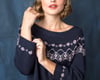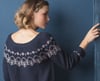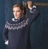 This pullover was inspired by sashiko and is worked from the top down, featuring a colorwork motif and linen stitch to keep the open, free-fl owing design. The sleeves are worked to three-quarter length and embellished with a section of the yoke motif. This beautiful sweater is intended to have a generous fi t in the Japanese fashion and is perfect for a day in the galleries. The collar, cuffs, and bottom edge are worked in linen stitch, and the bind-off creates a lovely, almost picot-like finish.