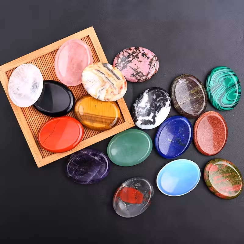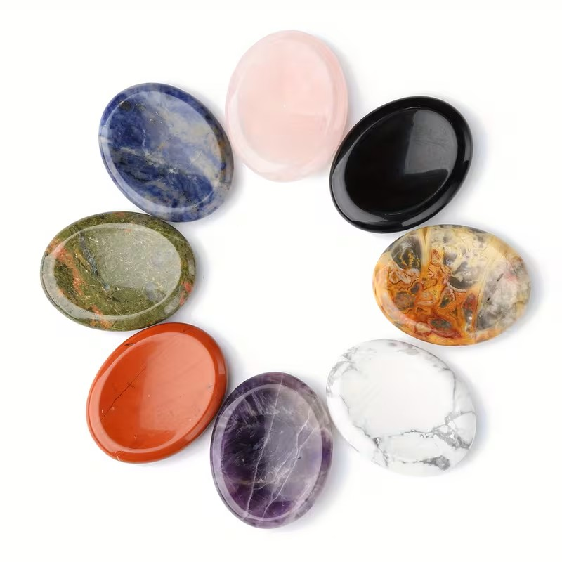 Tommelsteiner er glattpolerte steiner formet for å ligge godt i hånden, med en naturlig fordypning som passer tommelen. De brukes ofte som en bekymringsstein, et lite fokusobjekt i hverdagen eller som en dekorativ stein å ha med seg.
