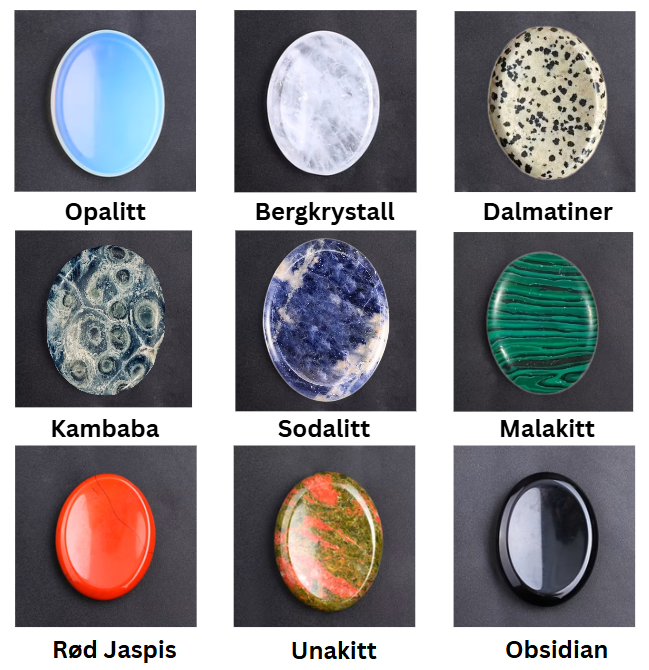 Hver tommelstein er laget av ekte stein eller mineral (med unntak der annet er tydelig oppgitt), og har sitt eget unike uttrykk. Naturlige variasjoner i farge, mønster og struktur vil derfor forekomme, og ingen steiner er helt like.