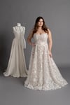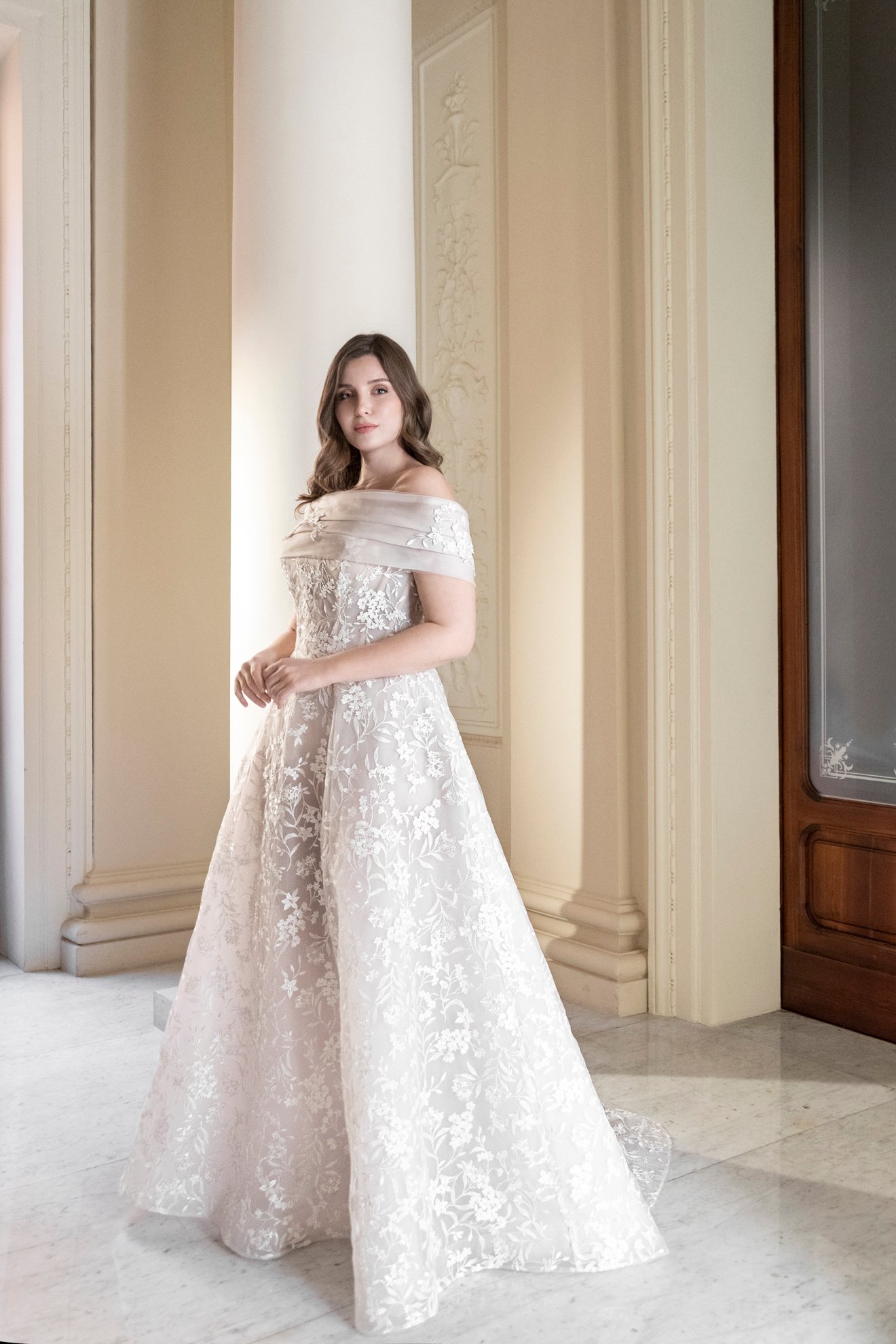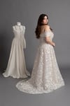 Abito da sposa sartoriale in pizzo ricamato luminoso.