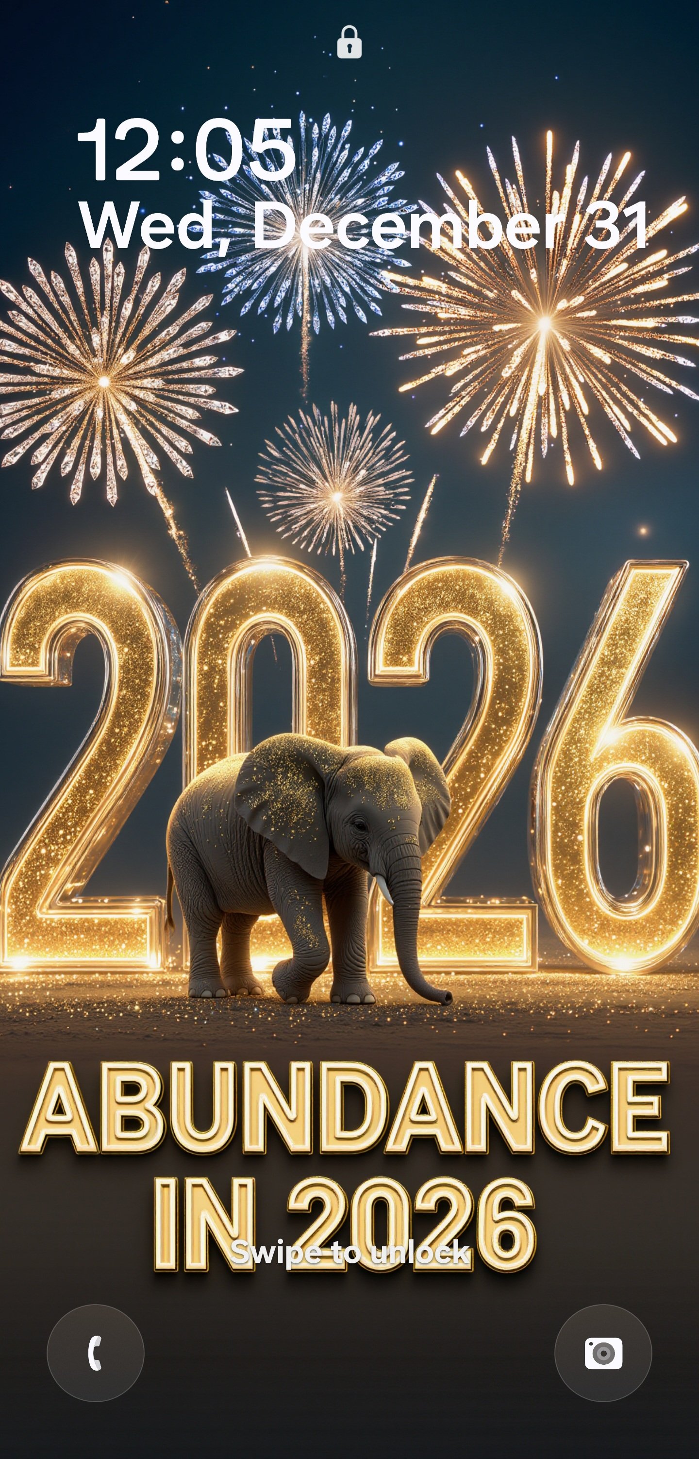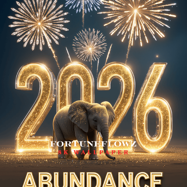Welcome 2026 with massive prosperity energy. This ultra-luxurious 8K wallpaper features dazzling golden fireworks exploding behind the glowing “2026” display, while a majestic elephant stands in front—symbolizing wealth, strength, and unstoppable success.