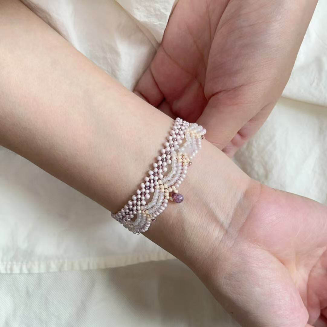 "Wisteria Manor" Handmade woven lace beaded French vintage palace style pink-purple artistic bracelet necklace set