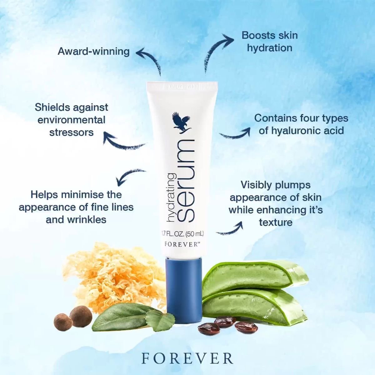 Every day your skin is exposed to environmental stressors that can cause dryness and contribute to the signs of aging. To keep your skin feeling young, supple and rejuvenated, add a boost of hydration to your skincare routine with Forever's hydrating serum. It will not only envelop your skin in silky moisture but also exponentially enhance the benefits of your favorite Forever moisturizer.