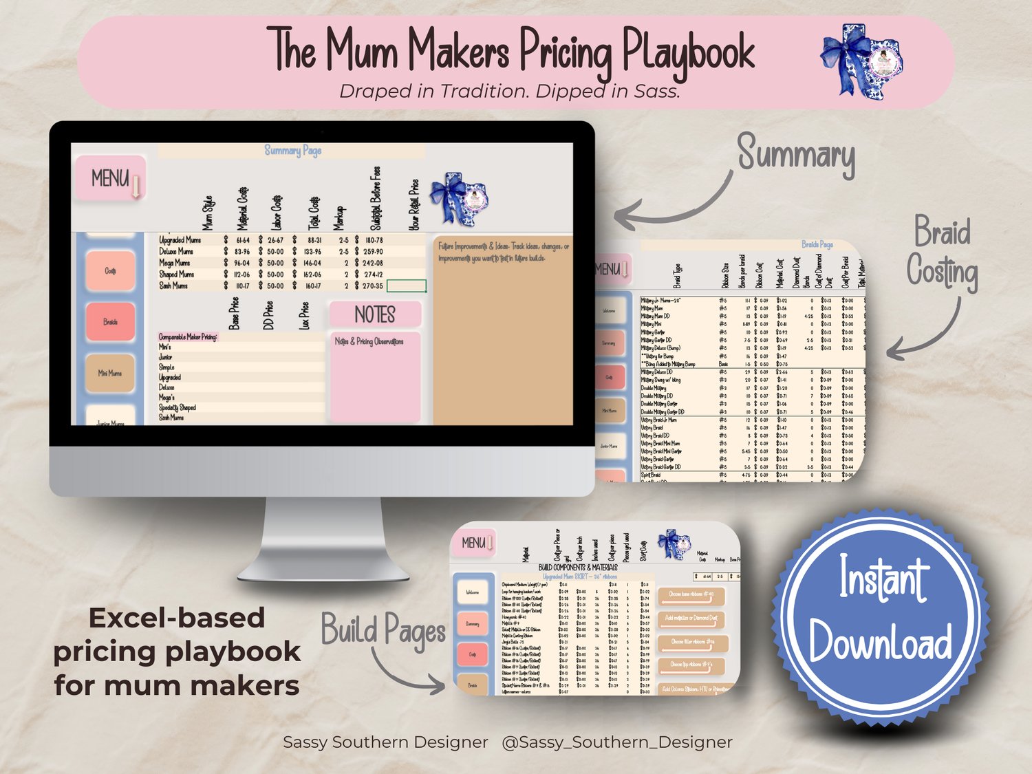 The Mum Makers Pricing Playbook is a done-for-you pricing workbook (Excel) created specifically for homecoming mum & garter makers who want consistent pricing that accounts for: