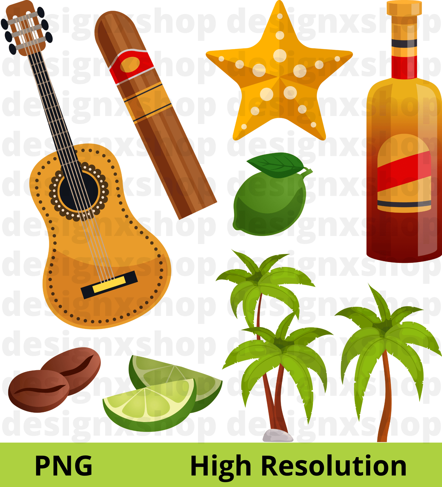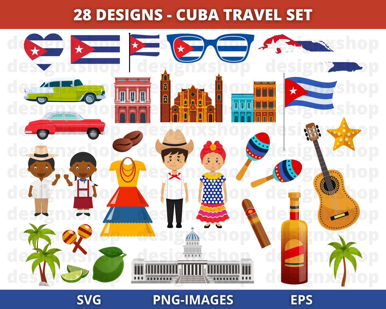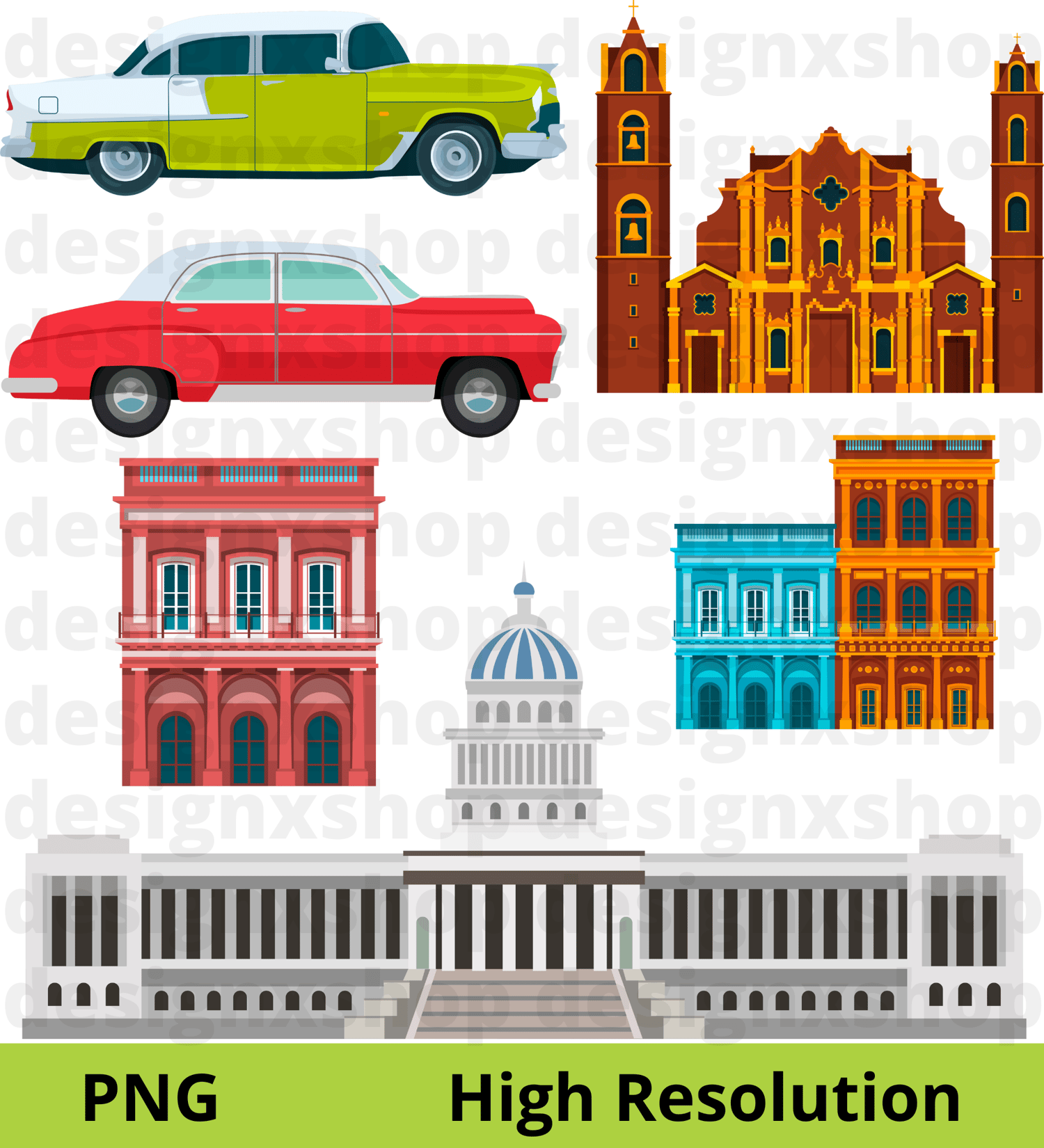 28 Designs - Cuba Havana Collection, hand drawn hi-res digital CLIP ART (with transparent background).