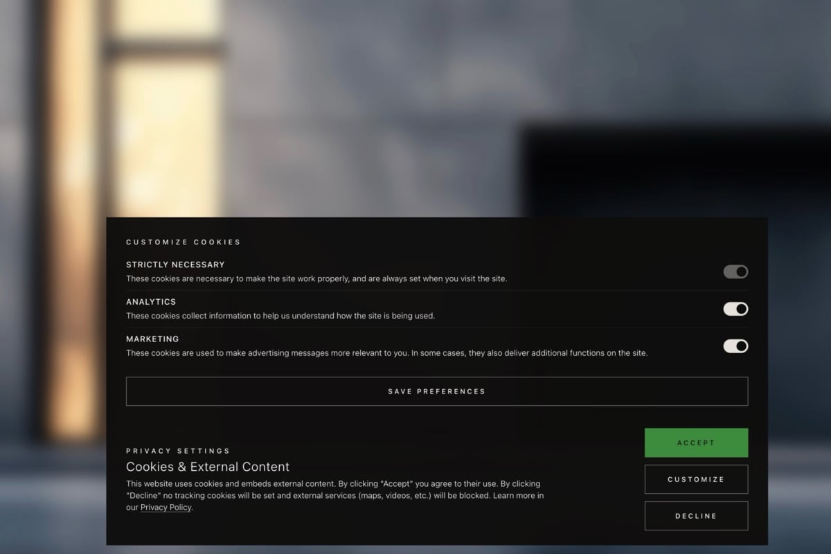 The Premium Cookie Banner Advanced gives visitors full control over their cookie preferences. Instead of just Accept or Decline, a third option — Customize — opens a dedicated settings panel where visitors can activate or deactivate Analytics and Marketing cookies independently. External content is blocked until consent is given — and restored instantly when they accept.