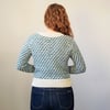 Mod Tweed is knit in one piece from the top down, starting with the collar. Short rows are used to shape the collar, and raglan seams are used to define the sleeves. Once the yoke is complete, the sleeve stitches are put on hold while the body is finished. The sleeves are then finished from the underarm down to the cuffs.