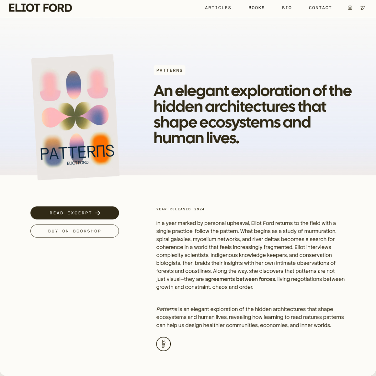 - Home: A welcoming landing page with bold headline space, a book cover feature, and a clear CTA.