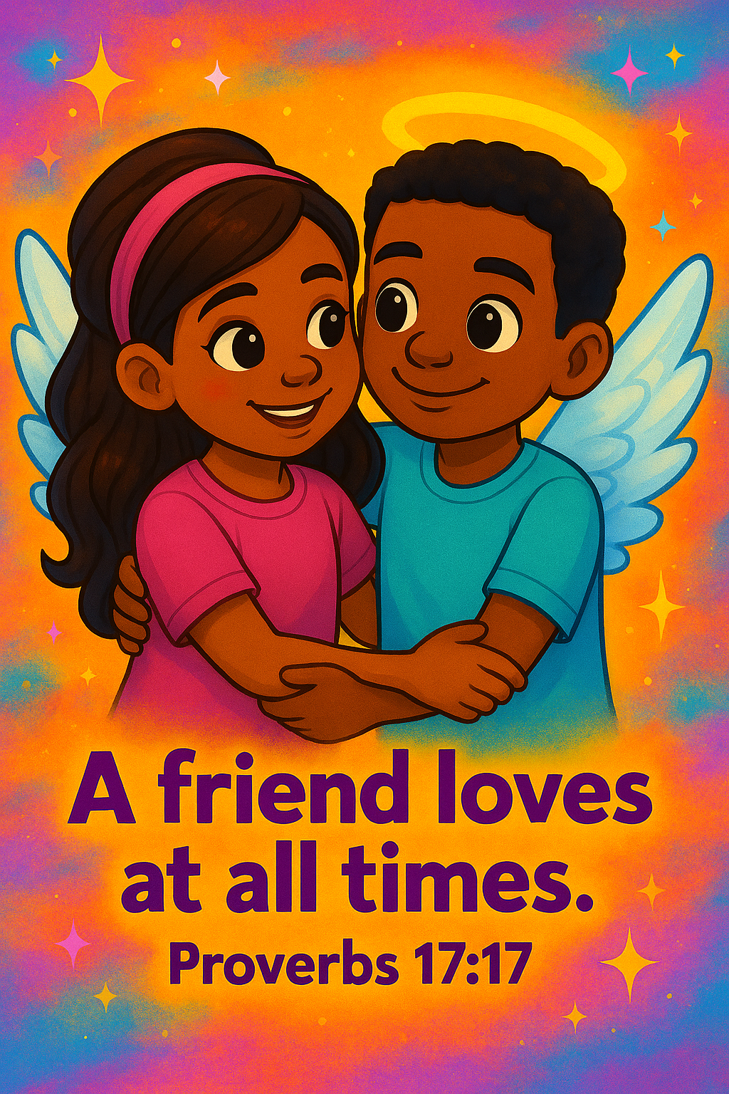Celebrate the beauty of friendship with this Proverbs 17 Angel Poster, featuring two smiling children with angel wings embracing under a glowing sky of sunset hues and sparkles. Paired with the scripture “A friend loves at all times,” this printable radiates warmth, connection, and spiritual joy — perfect for devotional kits, children’s ministry bundles, or homeschool inspiration.