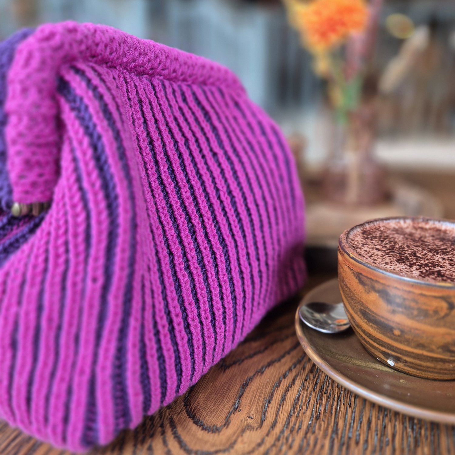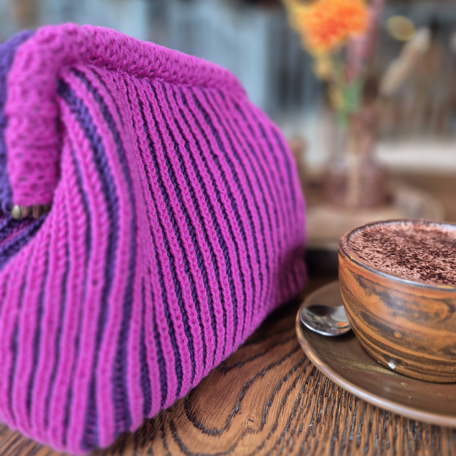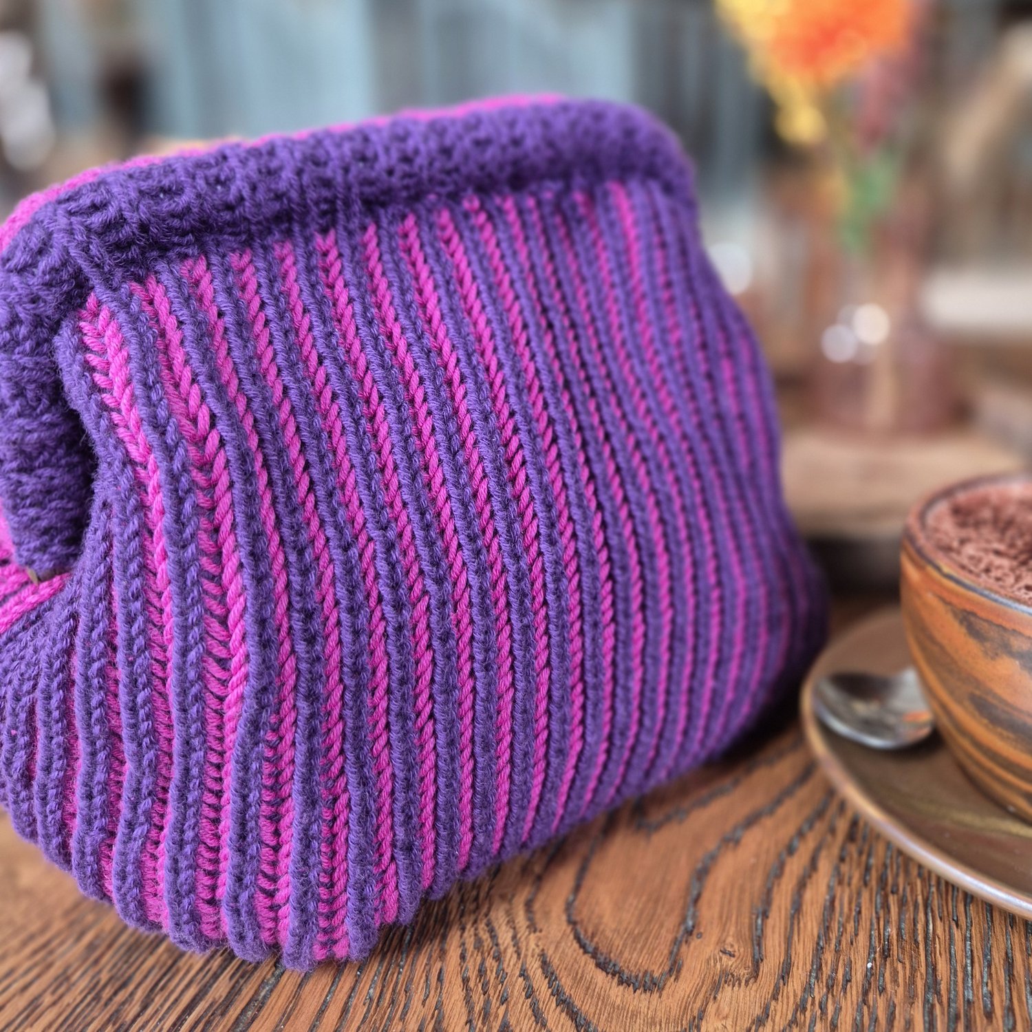 The Brioche Clutch can be used to hold your essentials for running errands, for a night out or as a project bag. The metal frame and felt lining (see pattern notes) allows the bag to sit upright when open. Perfect for carrying your knitting project, your day or evening essentials such as purse, phone, lipstick etc. See page 2 of the pattern (or below) for links to several tutorials including how to knit brioche and how to add the lining.