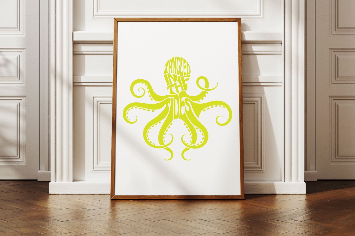 This design features the words Tangled in the Tides creatively made into the shape of an Octopus.