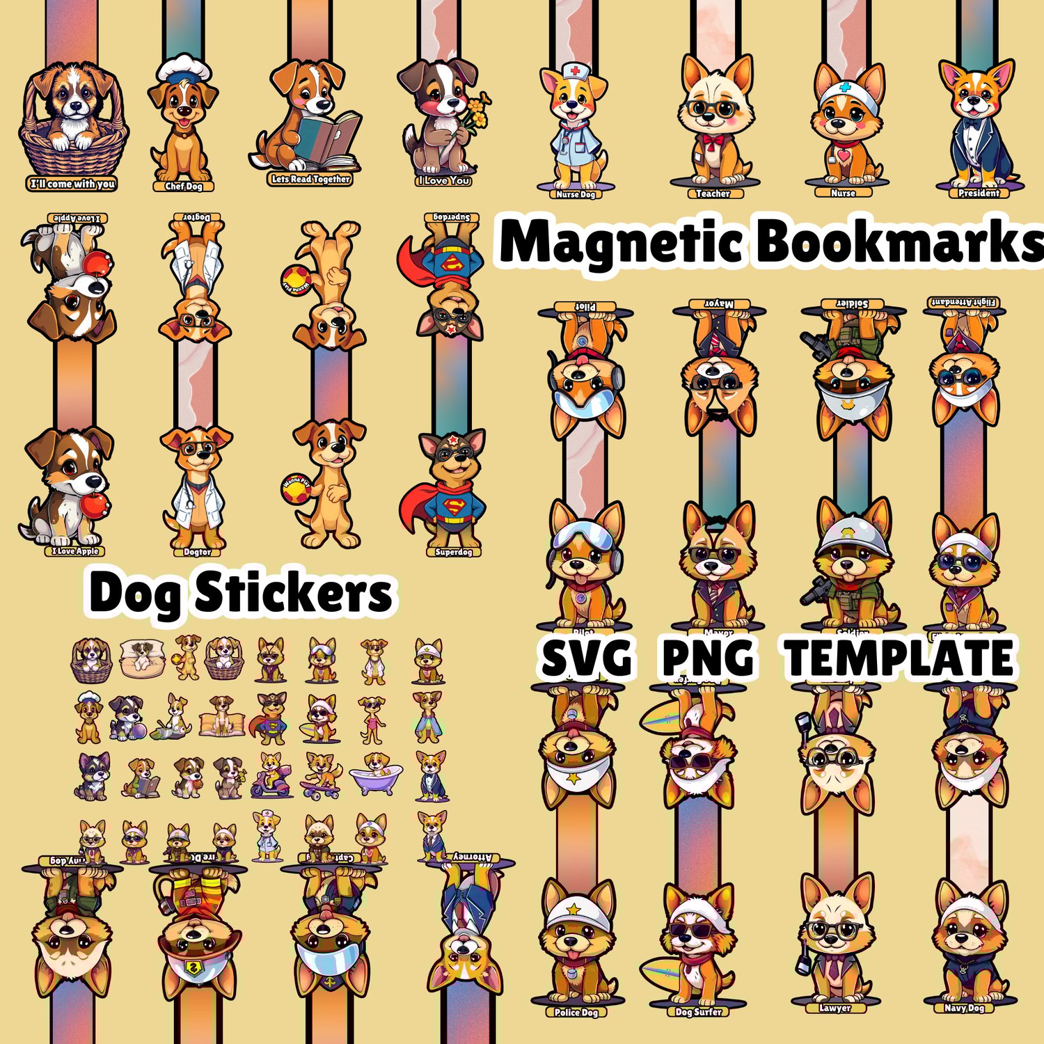You will get 28 magnetic bookmark and 44 dog stickers or clipart. Available also in template format.