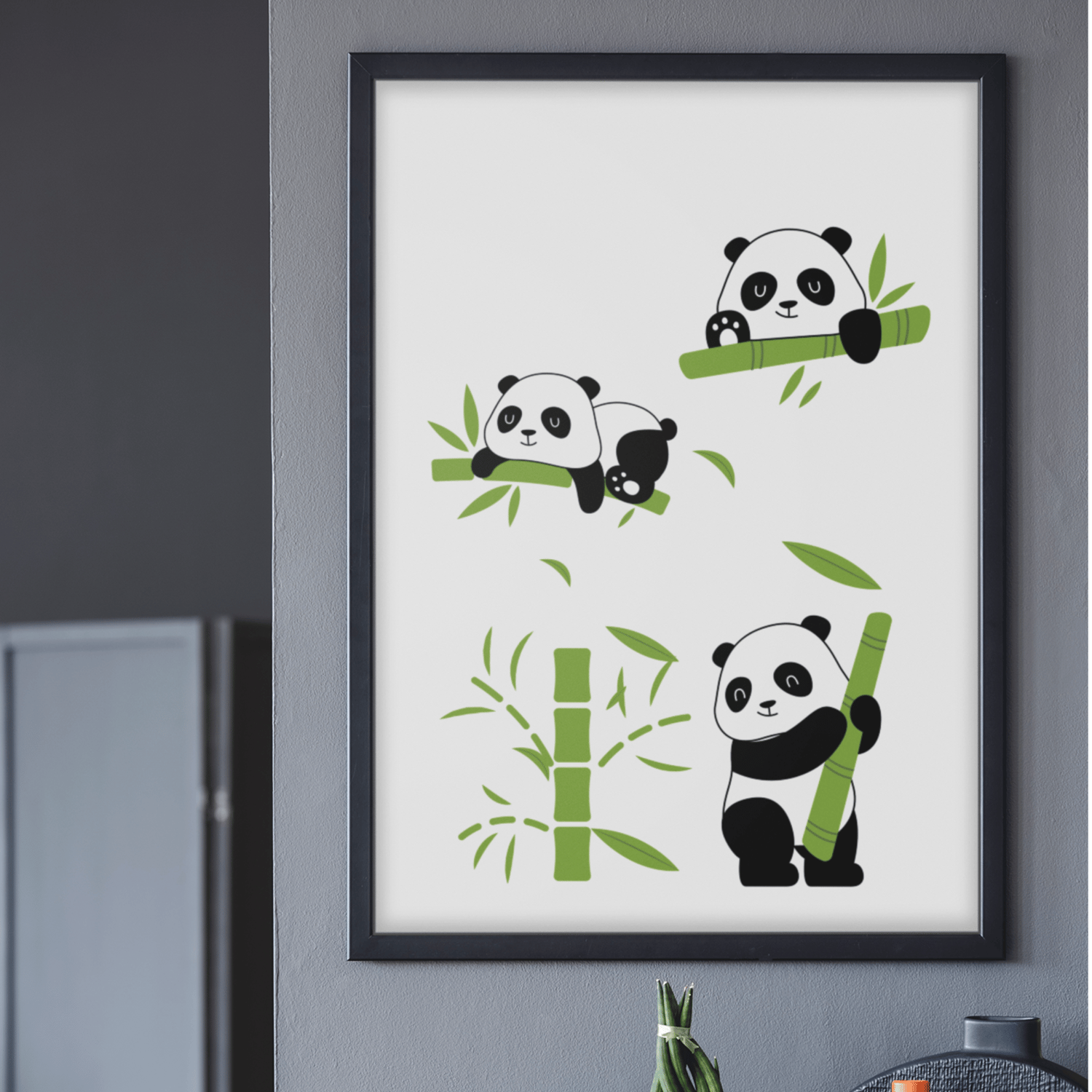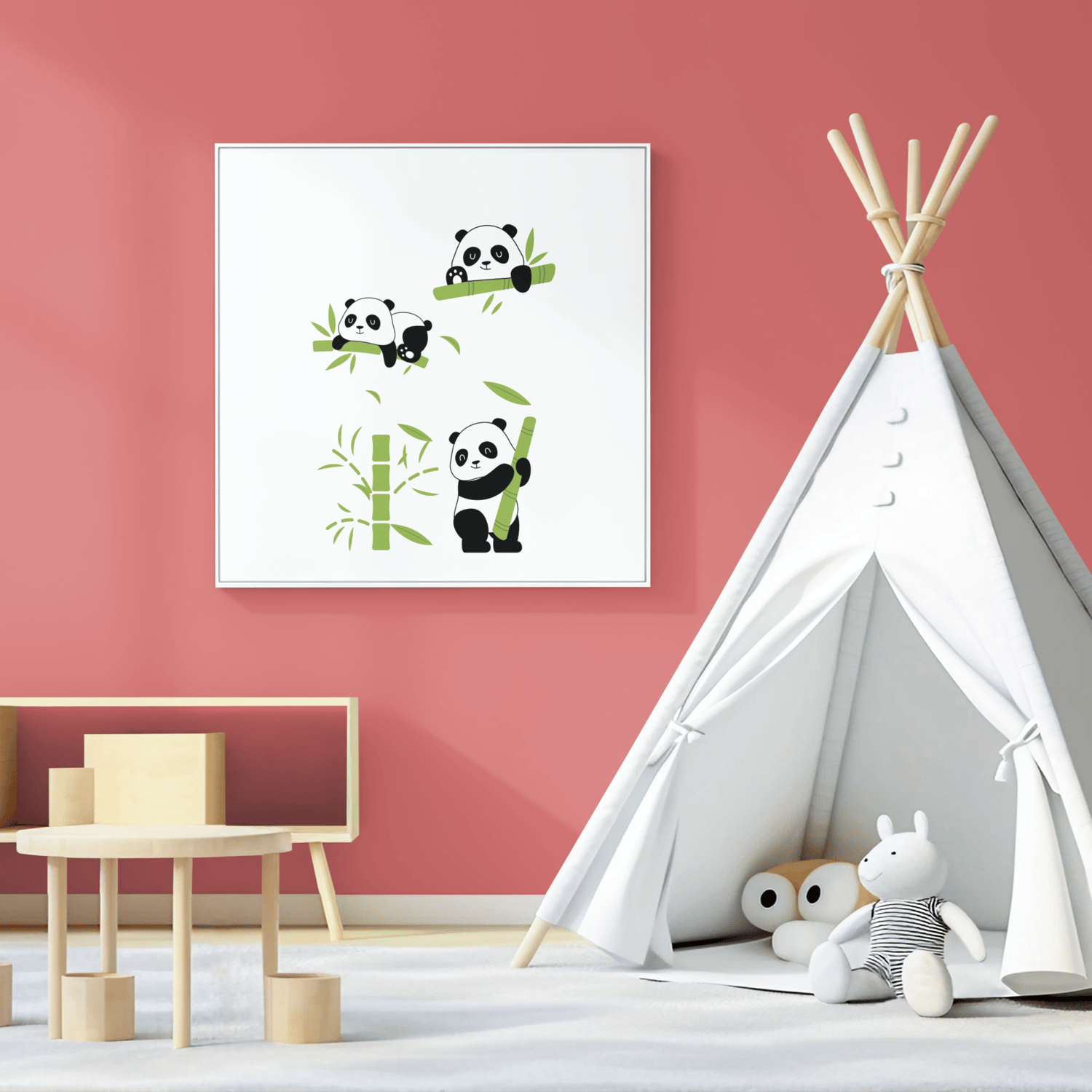 Featuring adorable pandas playing with bamboo, this artwork creates a happy, calm, and playful atmosphere in nurseries and kids rooms.