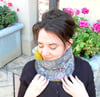Stitches are provisionally cast-on before working the ‘tile’ motif, then a folded hem is created and the inner lining of the cowl worked. The edges are then joined with a 3-needle bind off. You may add, optional, embroidery details over the ‘tile’ motif.