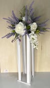These table centerpiece stands can be used to display floral arrangements or other items in the center of your event tables. The stand is 18" x 6", and the legs are each 1" in width..