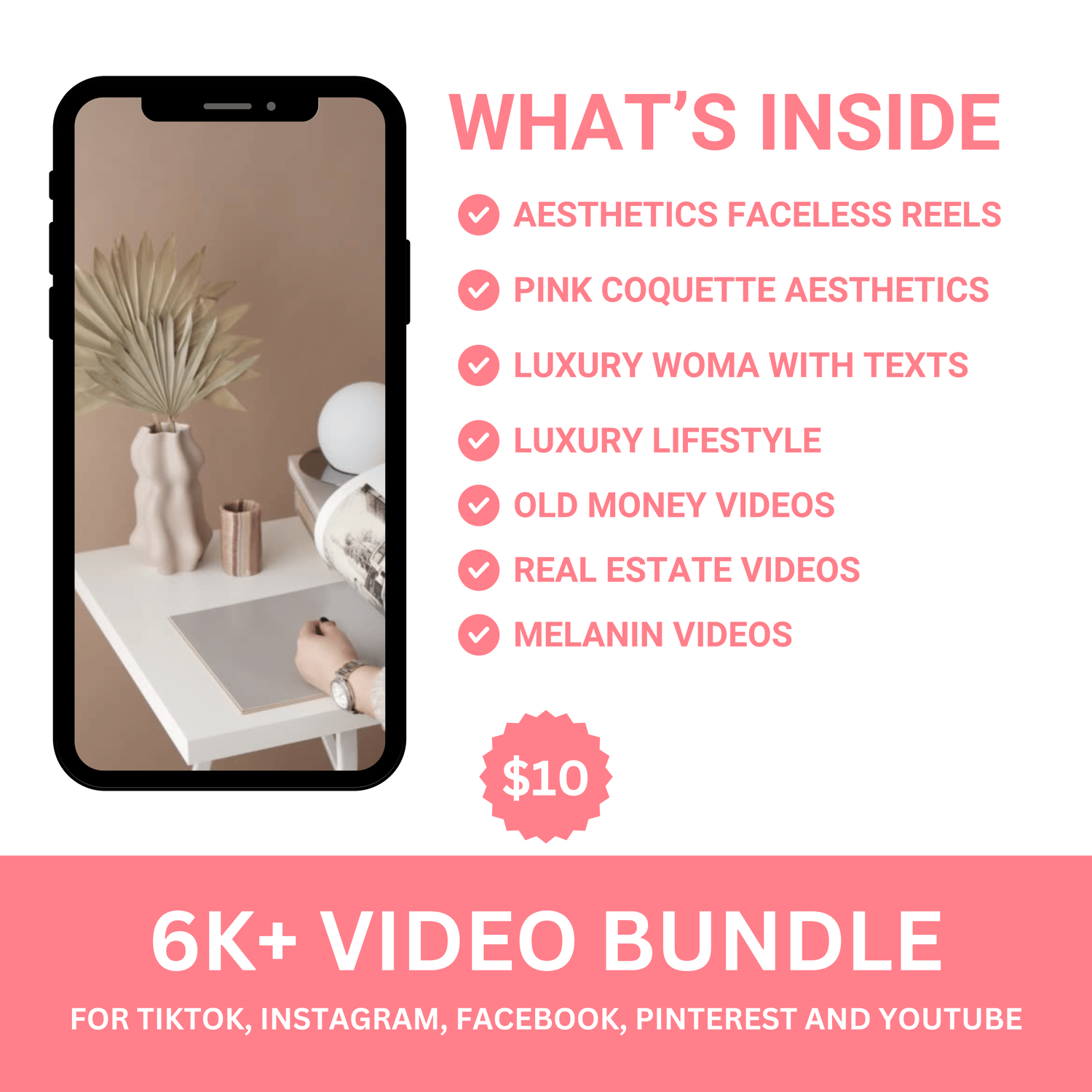 ✅ 6,000+ Viral-Worthy Aesthetic Videos — Faceless reels, luxury woman lifestyle, pink coquette, melanin-rich visuals, old money style, and even real estate themes.