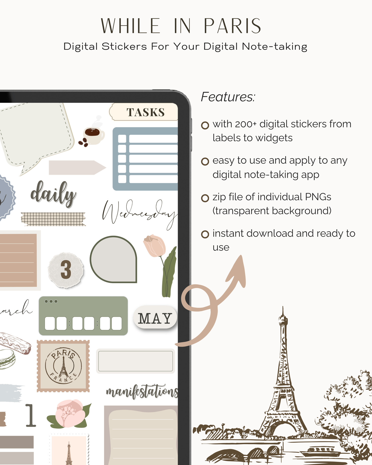 Immerse your digital note-taking journey in the timeless elegance and romantic allure of the City of Lights. The While in Paris collection is a meticulously crafted stickers that features Parisian charm, featuring iconic landmarks like the Eiffel Tower, the delicate Parisian florals, and mostly the charming colors in the city. Elevate your digital planning experience and let the spirit of Paris accompany you wherever your digital adventures take you.