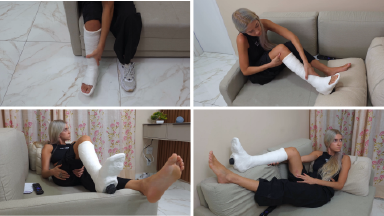 Hannah gently runs her hands over her cast as she watches the movie Lucy.