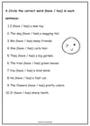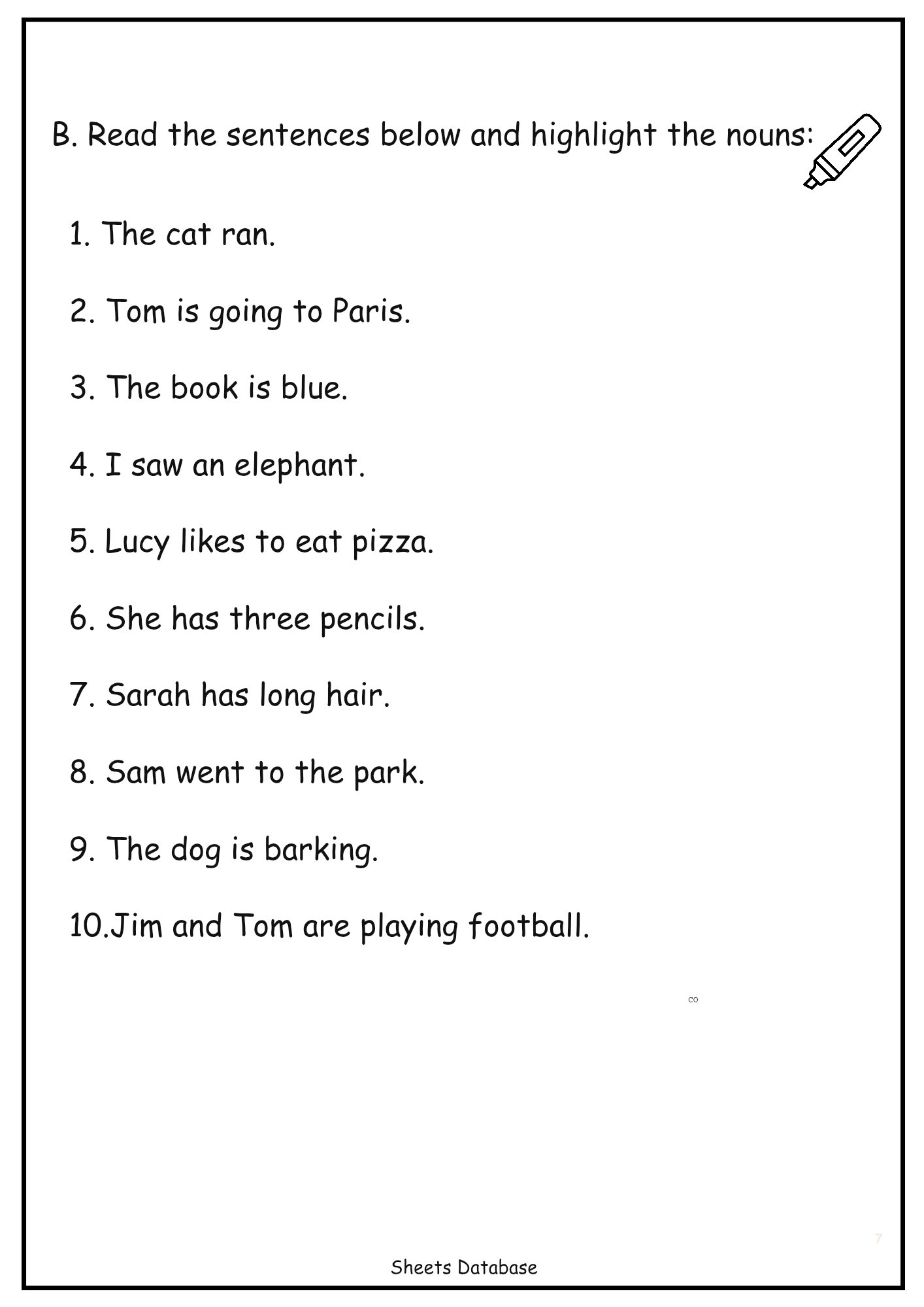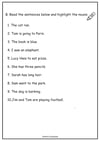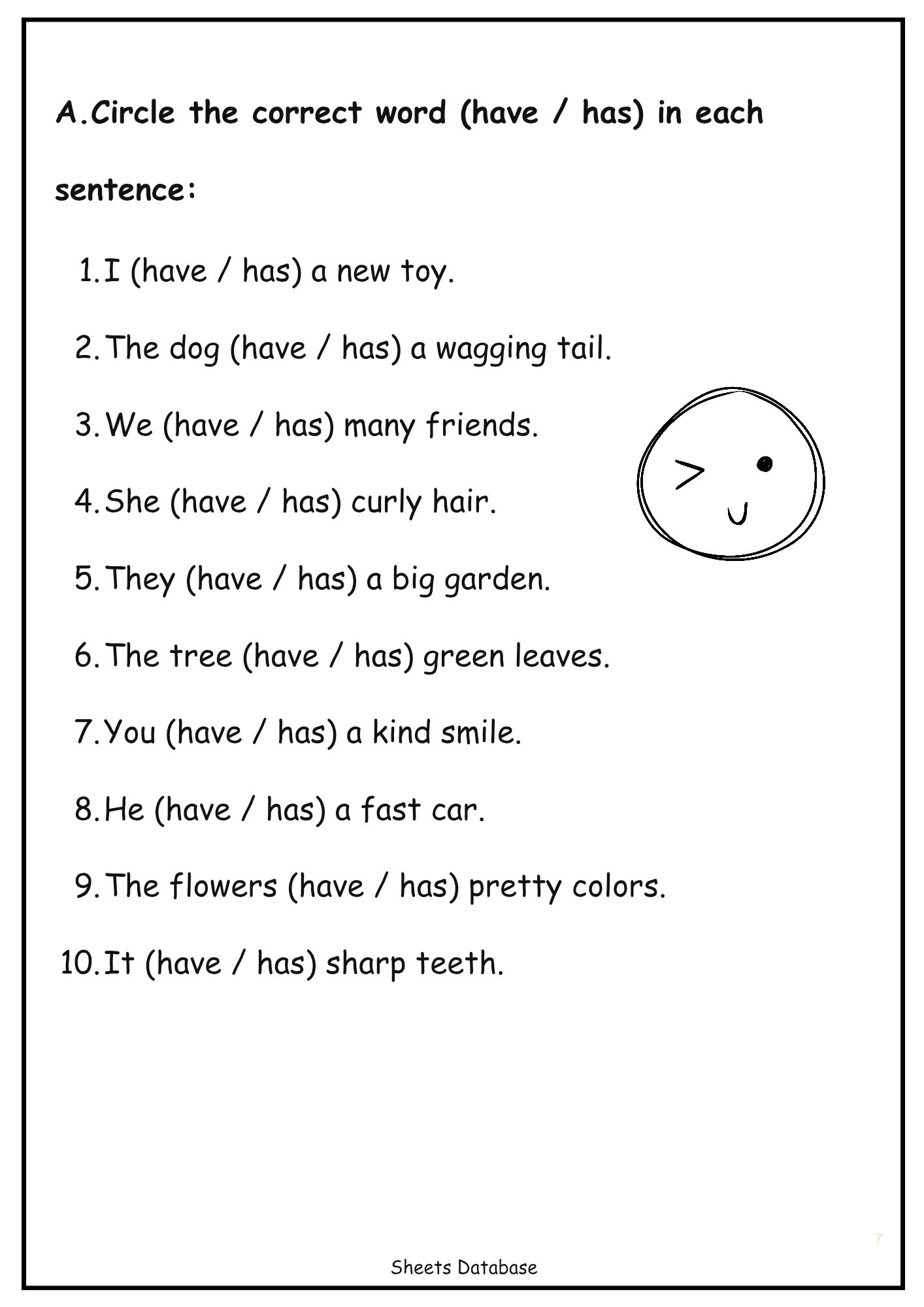 Focuses on present simple, subjectβverb agreement, question words, punctuation, adverbs, object pronouns, and possessive forms.