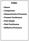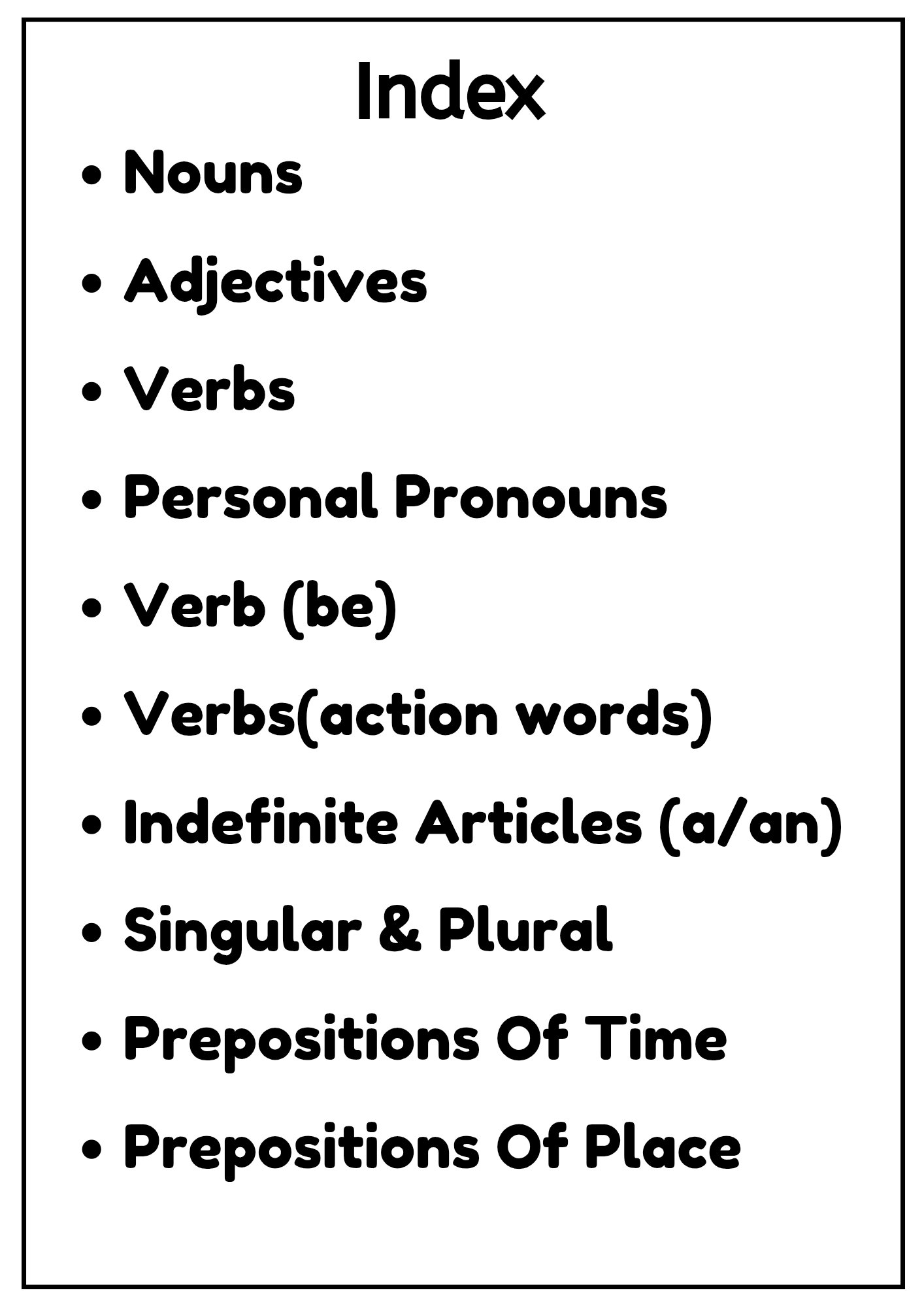 Covers basic grammar foundations such as nouns, verbs, adjectives, personal pronouns, verb to be, singular & plural nouns, and prepositions.