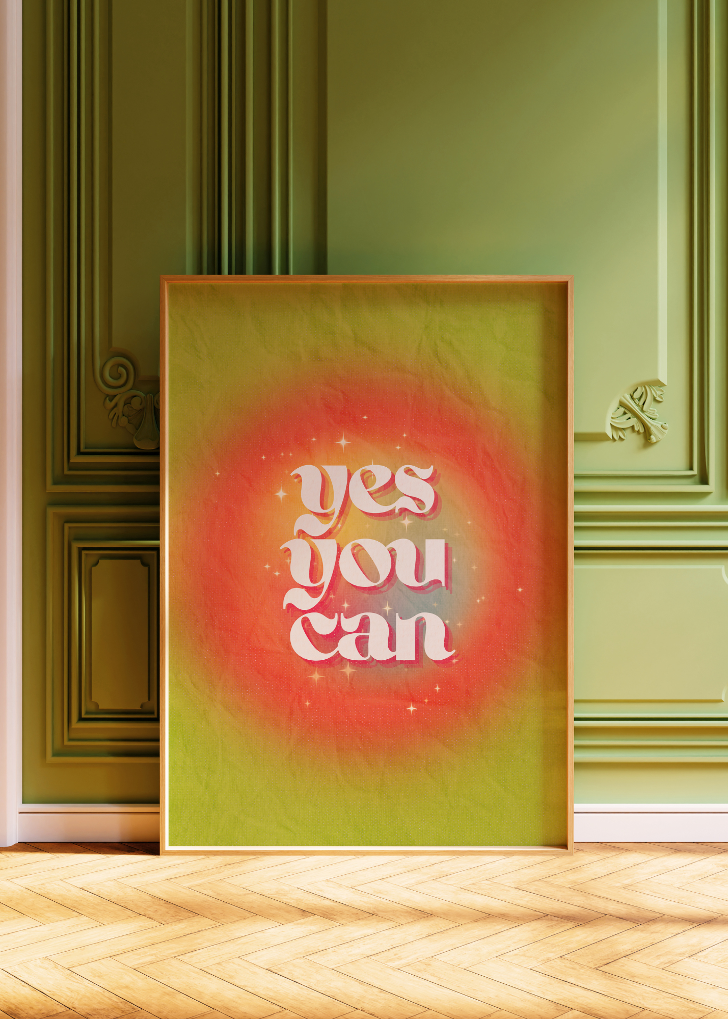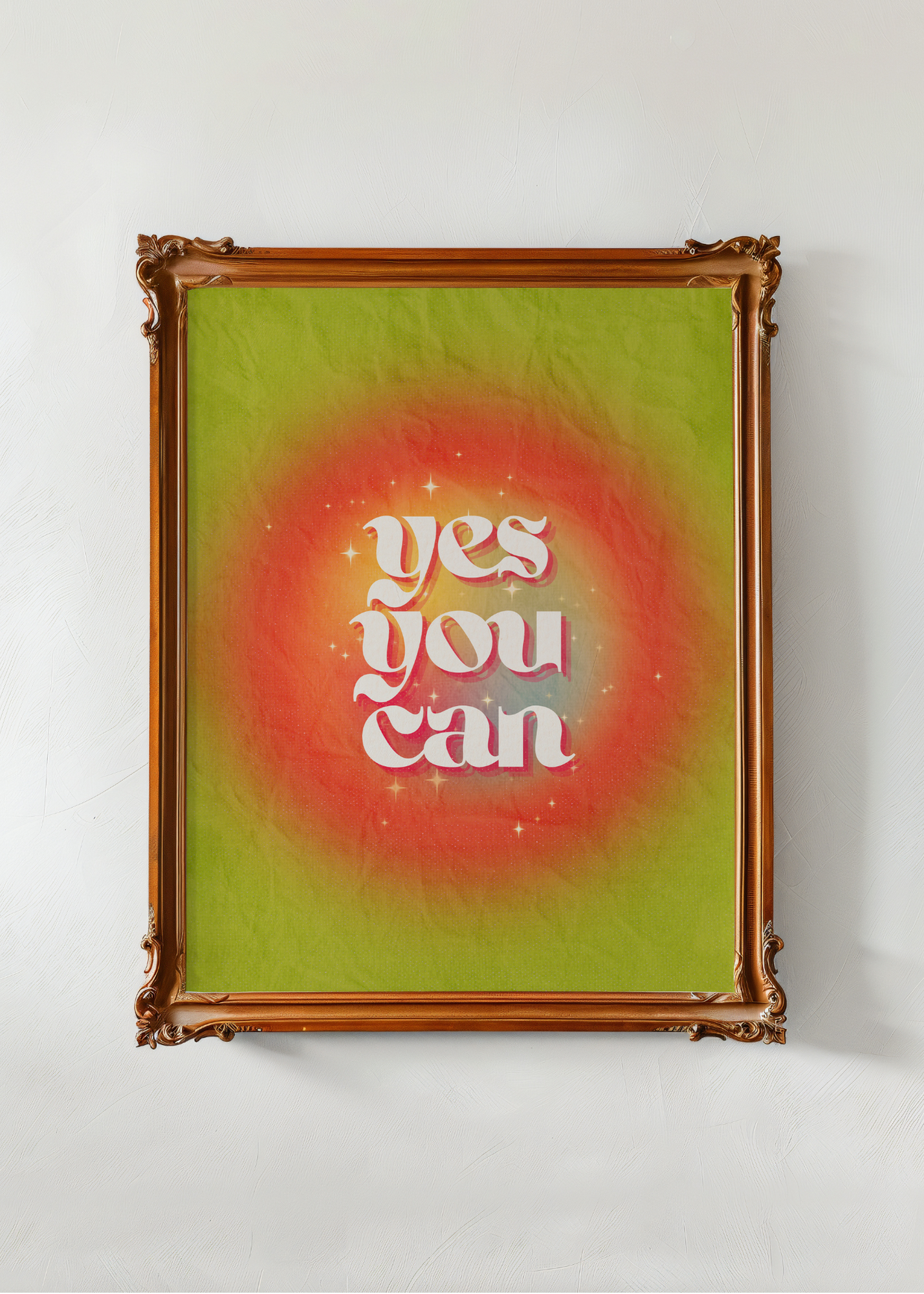 Yes You Can— Set against a lively lime green backdrop, this radiant print centers on a glowing, sunlike burst of orange that fades into a dreamy halo of yellow, green, blue, and purple. Soft twinkling stars float gently across the colors. At the heart of it all, bold white lettering affirms: “yes you can.” This print is a bright, empowering reminder of your strength, made to lift spirits and spark courage every time you see it.