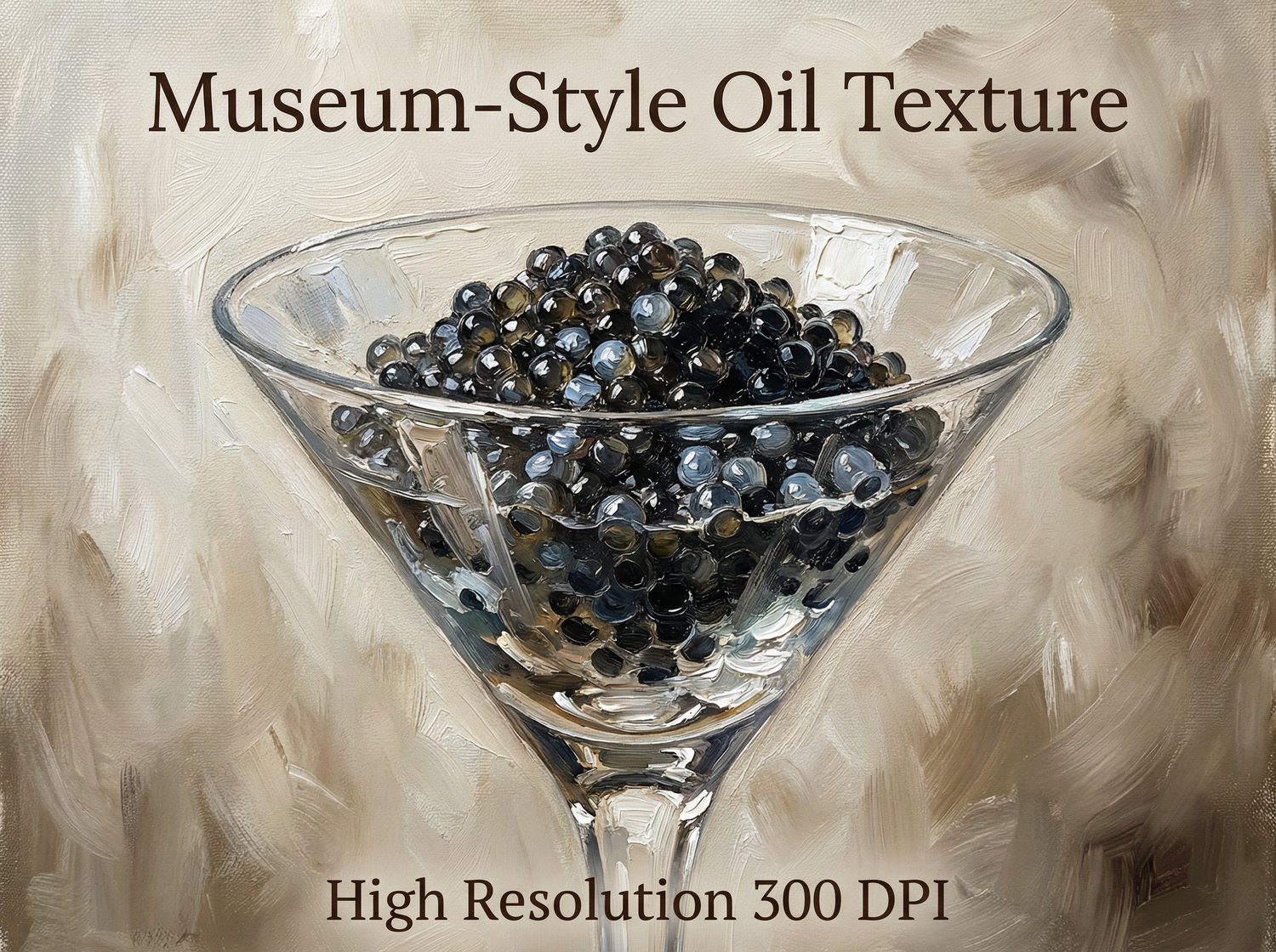 This premium oil-painting-style still life features a crystal martini glass filled with glossy black caviar, resting softly on warm linen fabric — refined, minimal, and quietly bold.