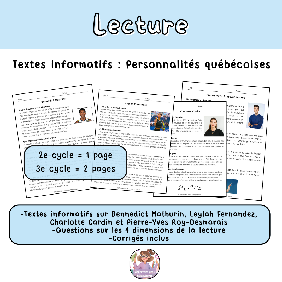 Vous trouverez 4 textes informatifs sur les personnalités québécoises suivantes : Bennedict Mathurin, Leylah Fernandez, Charlotte Cardin et Pierre-Yves Roy-Desmarais. Chaque document comprend également des questions sur les 4 dimensions de la lecture ainsi que le corrigé. Ce sont des textes adaptés au niveau des élèves, mais plus courts (2 pages), donc idéals pour les ateliers ou les périodes d’orthopédagogie.
