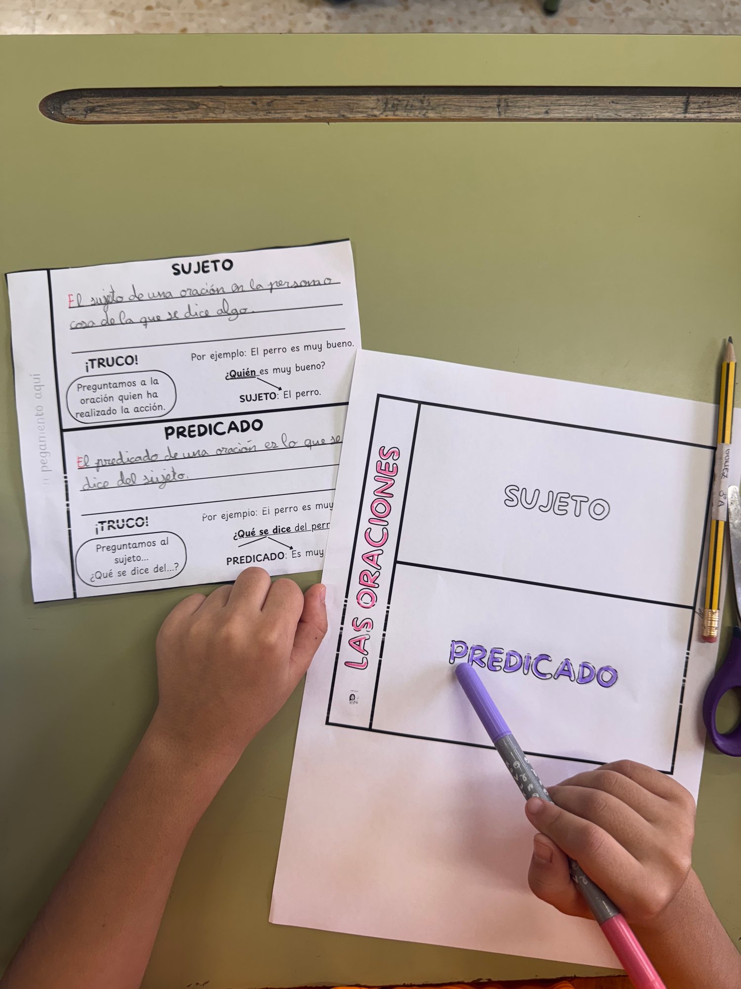 👩🏫 Los alumnos deberán recortar las piezas, escribir dentro el significado de cada elemento (qué es el sujeto, qué es el predicado y cómo diferenciarlos) y, después, colorearlo y pegarlo en su libreta 🖍️.