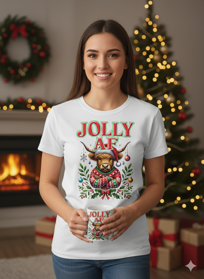 Bring some attitude to your holiday merch with this Jolly AF Highland Cow Christmas PNG!