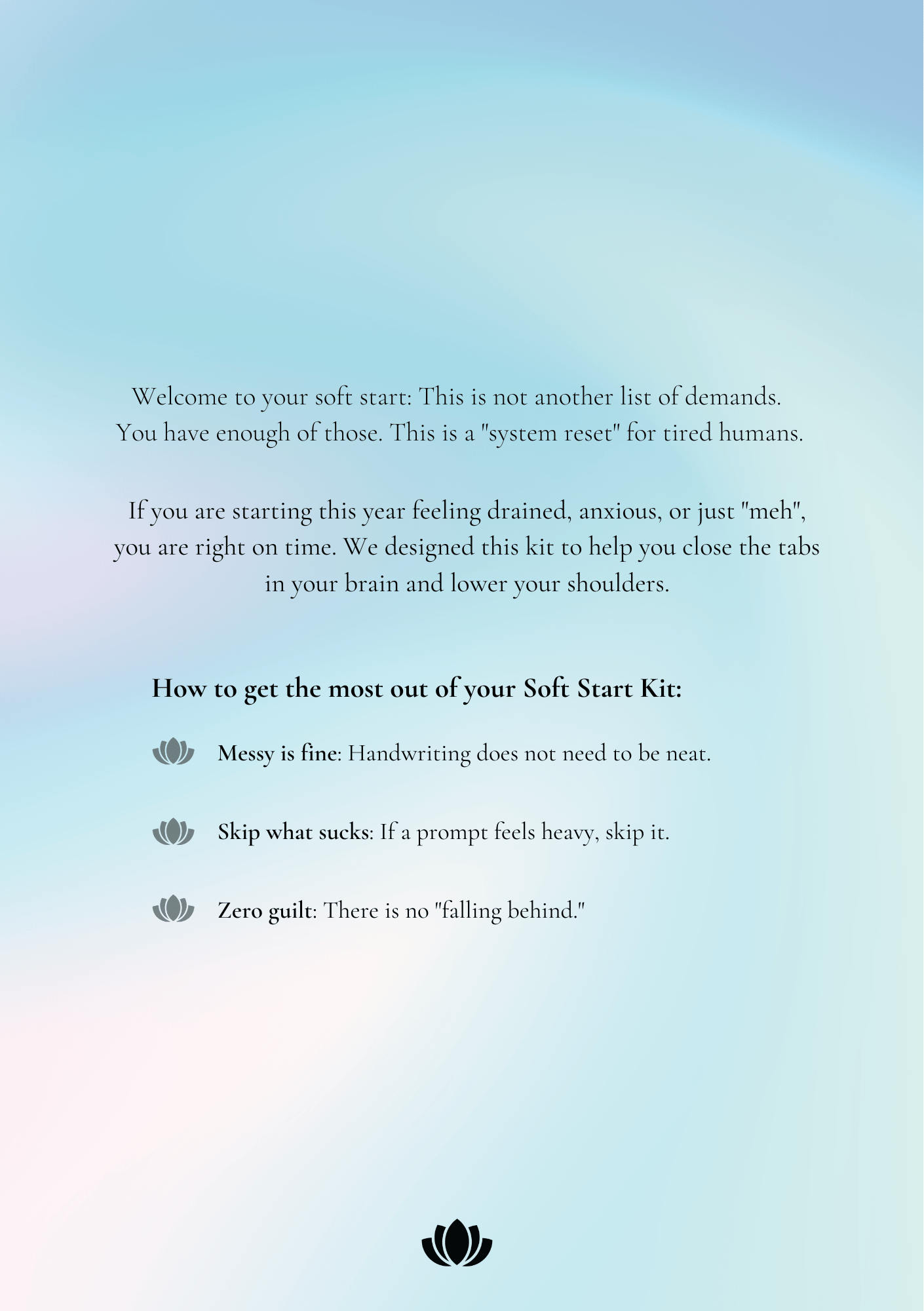 The Soft Start Kit is a gentle reset for days when everything feels like too much. It’s a short, thoughtfully designed guide with simple prompts, grounding exercises, and reflective check-ins to help you slow down, lower the pressure, and reconnect with yourself — without adding another thing to your to-do list.