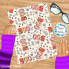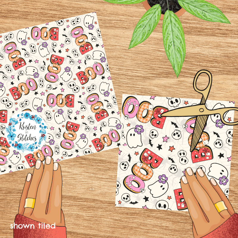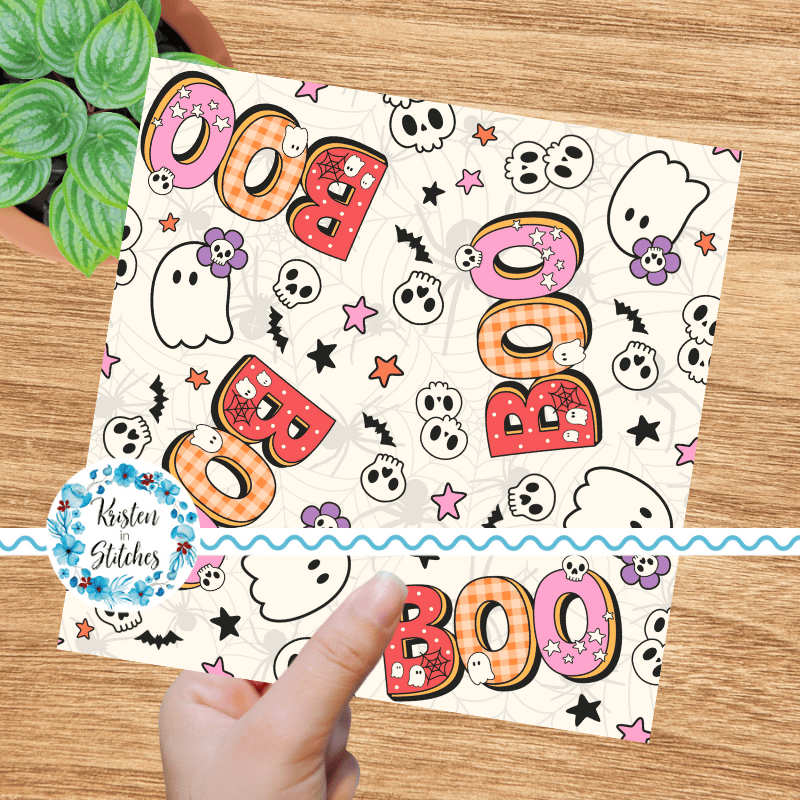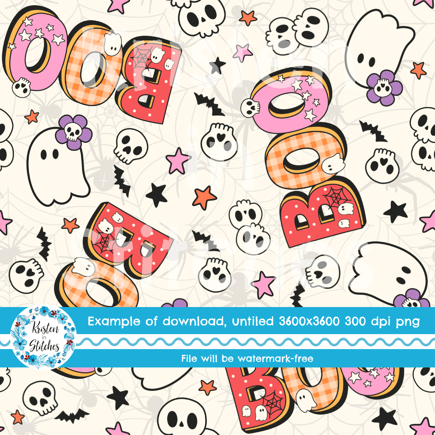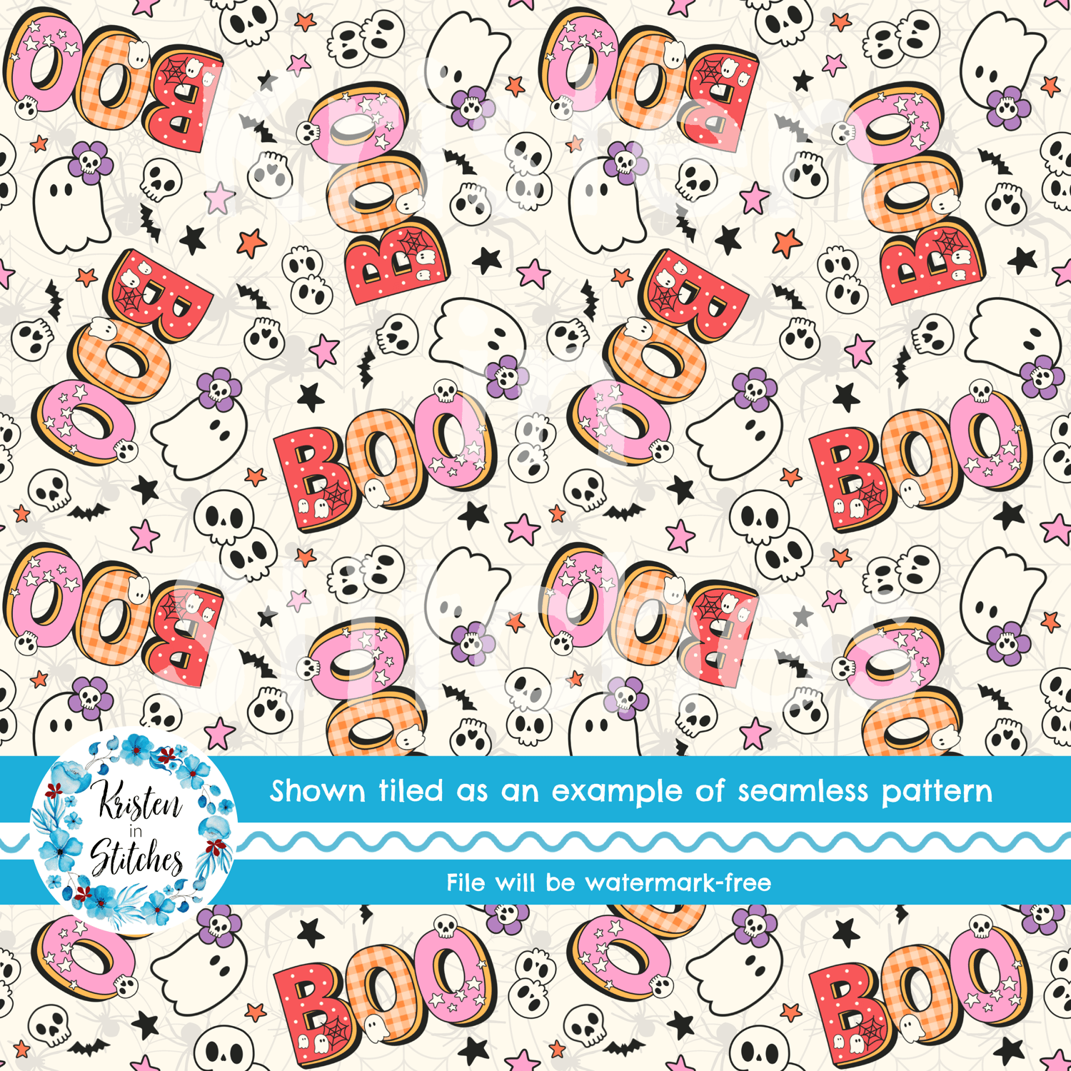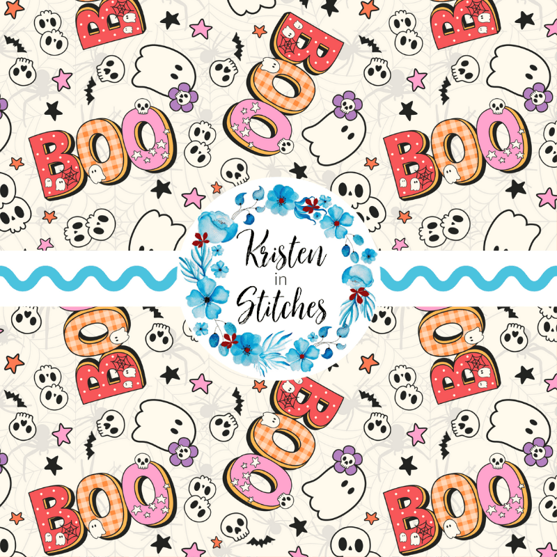 Halloween BOO letters, bats, ghosts and skulls in a non-directional pattern.
