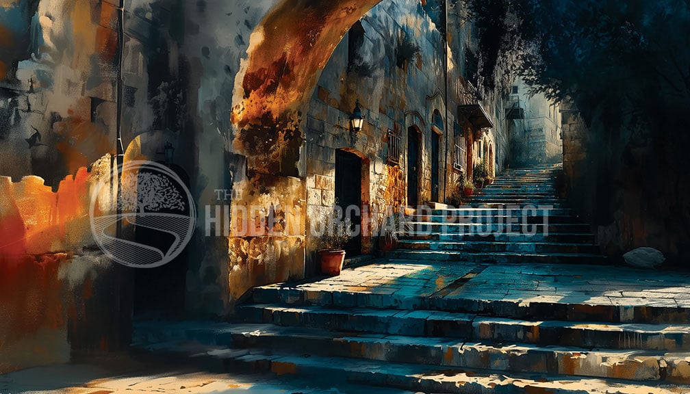 A depiction of a sunrise in the ancient streets of Jerusalem. 14x8