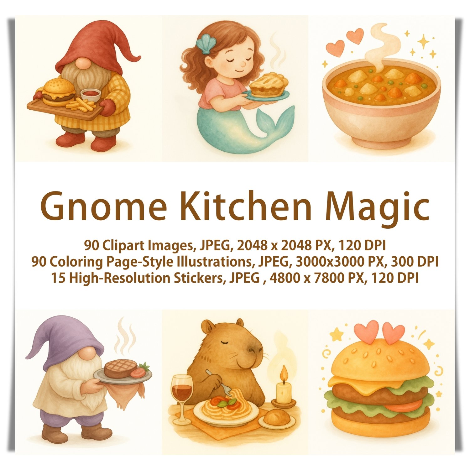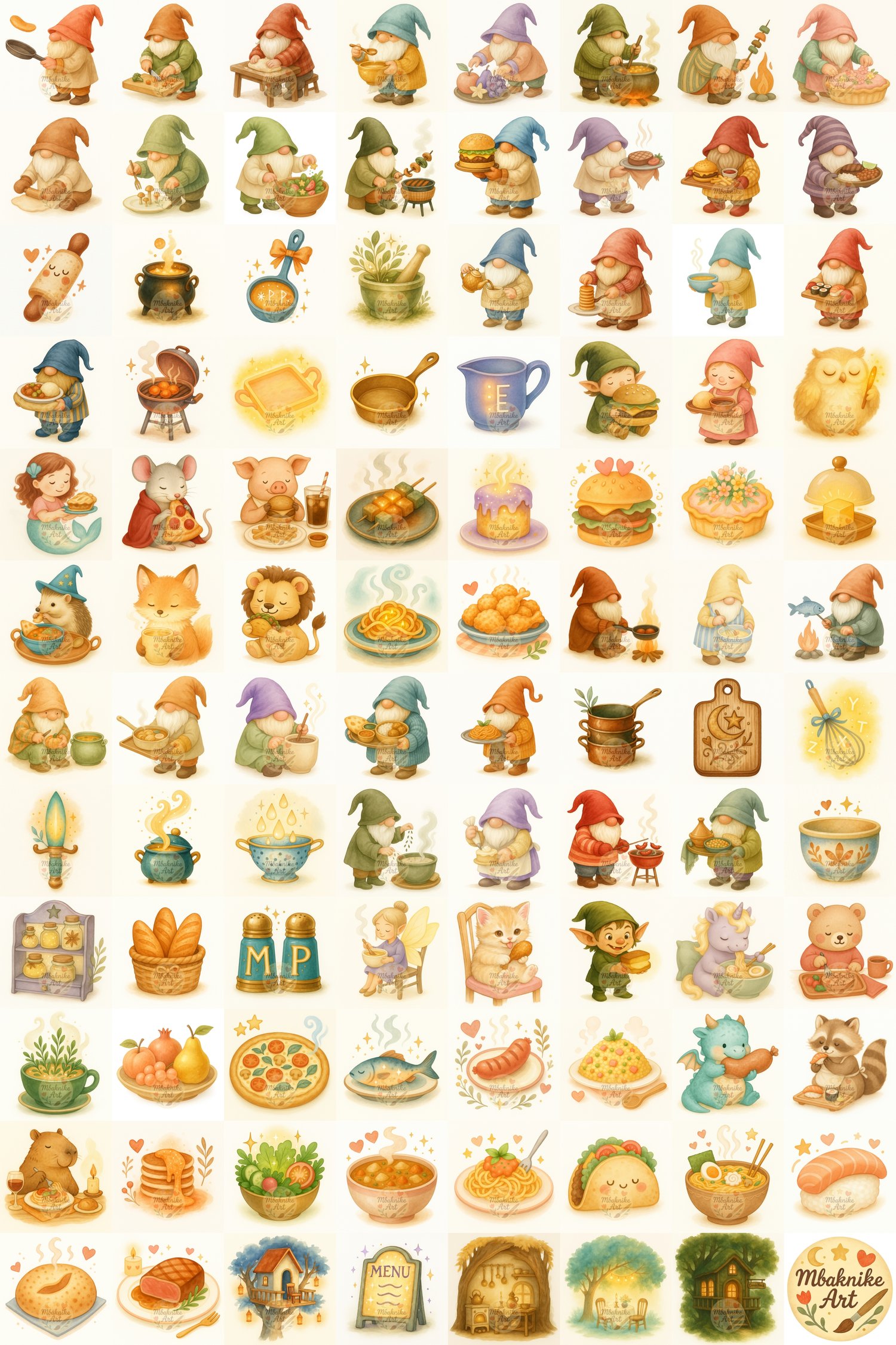 - 90 Clipart Images JPEG format · 2048 x 2048 px · 120 DPI Featuring charming gnomes cooking up hearty meals like burgers, pizza, fried rice, soup, and pasta—with magical sparks and steam that evoke enchanted kitchens. Food companions like elephants, capybaras, and gnomes in berry-topped aprons add charm and personality to each scene.