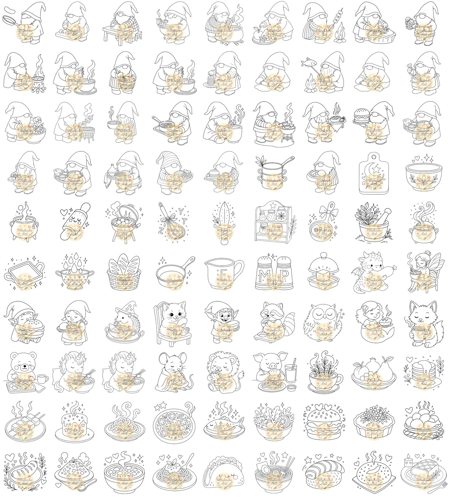 - 90 Coloring Page-Style Illustrations JPEG format · 3000 x 3000 px · 300 DPI Black-and-white line drawings drawn from selected clipart pieces—perfect for cozy coloring pages, kitchen-themed journals, and printable storytelling sheets filled with food and fantasy.