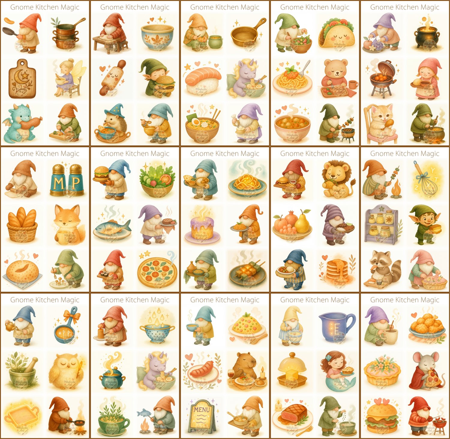- 15 High-Resolution Stickers JPEG format · 4800 x 7800 px · 120 DPI Curated from the most delicious magical food scenes—including gnome burger chefs, jam-makers, soup stirrers, sushi servers, and pasta pot carriers. Perfect for recipe cards, scrapbook pages, meal planner decor, or DIY kitchen printables.