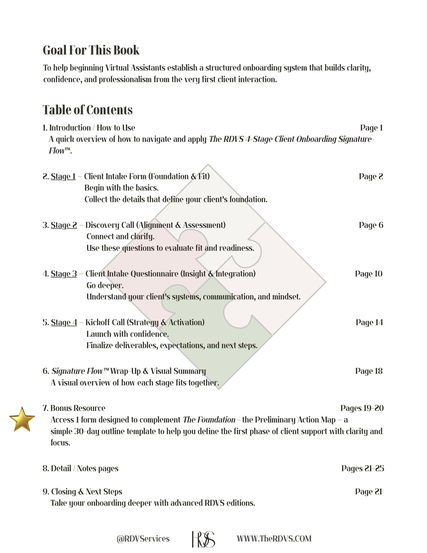 Built on The RDVS 4-Stage Client Onboarding Signature Flow™, this resource walks you step-by-step through every stage of the client journey — Intake, Discovery, Questionnaire, and Kickoff — so you can build trust, establish systems, and start strong.