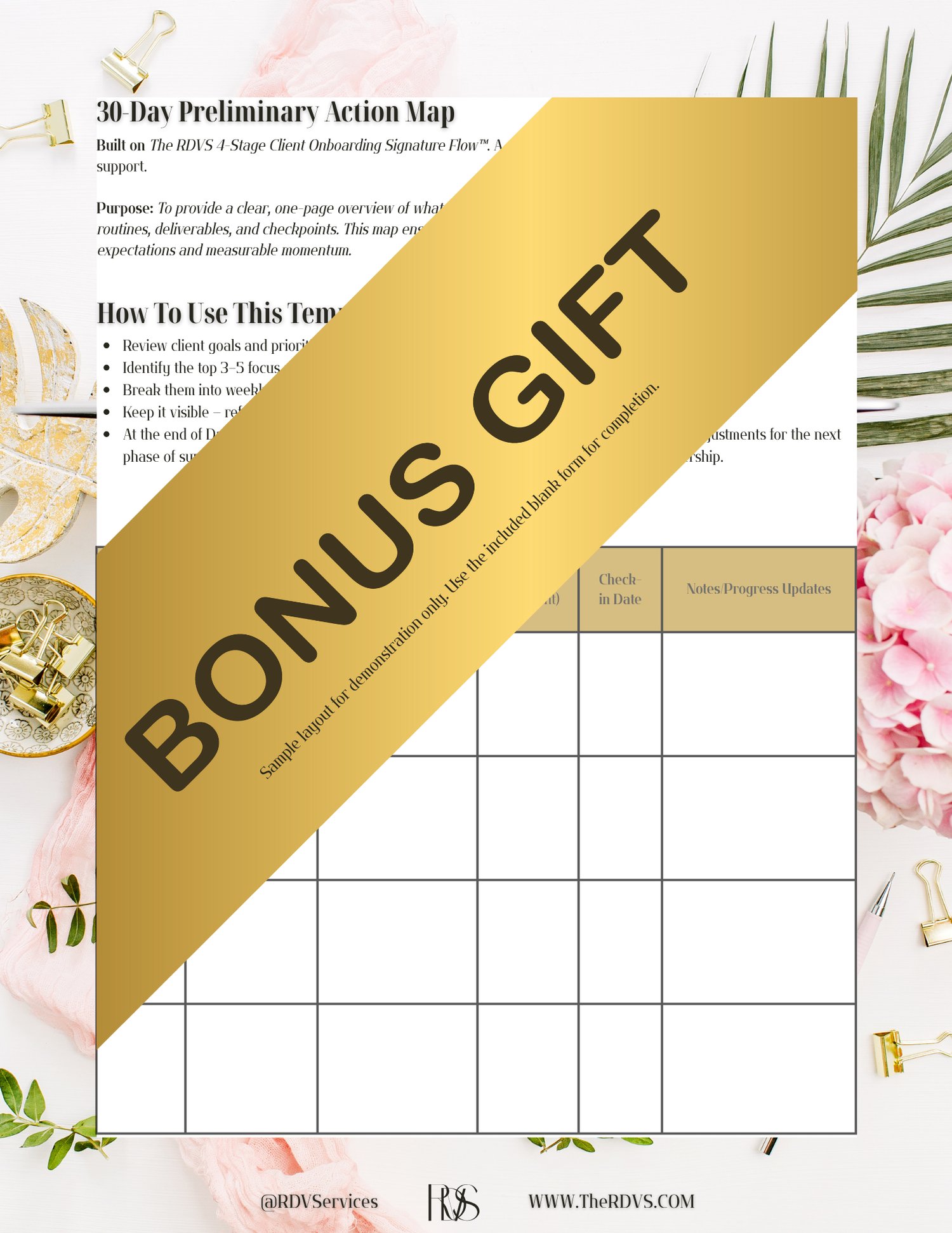 Your purchase includes 5 clean pages for additional notes and a FREE 30-Day Action Map, a fillable template to help you outline and manage the first month of client support with ease and structure.