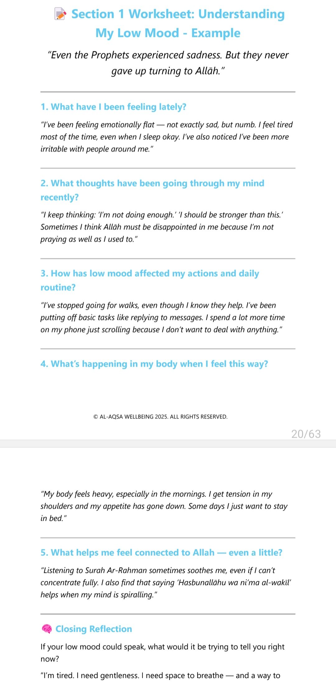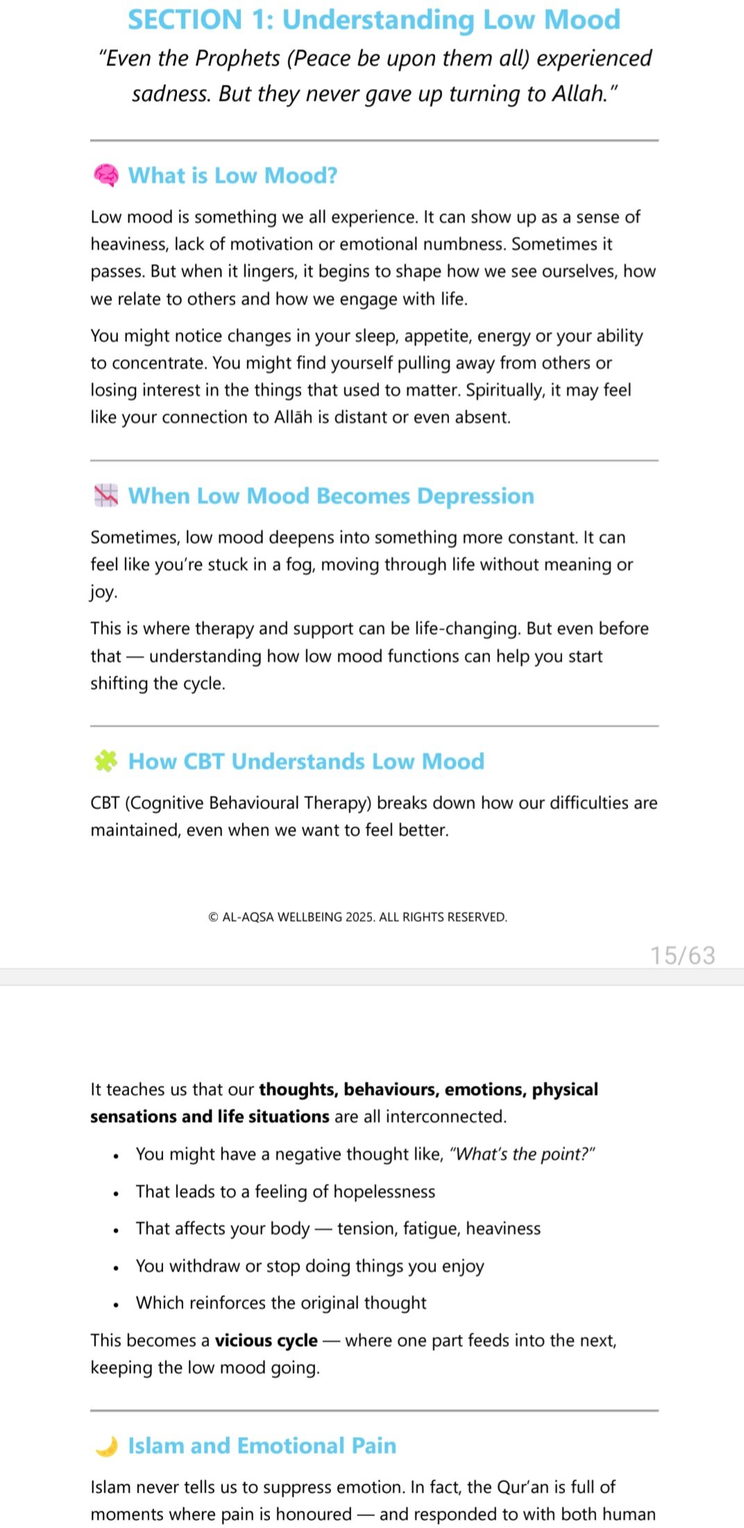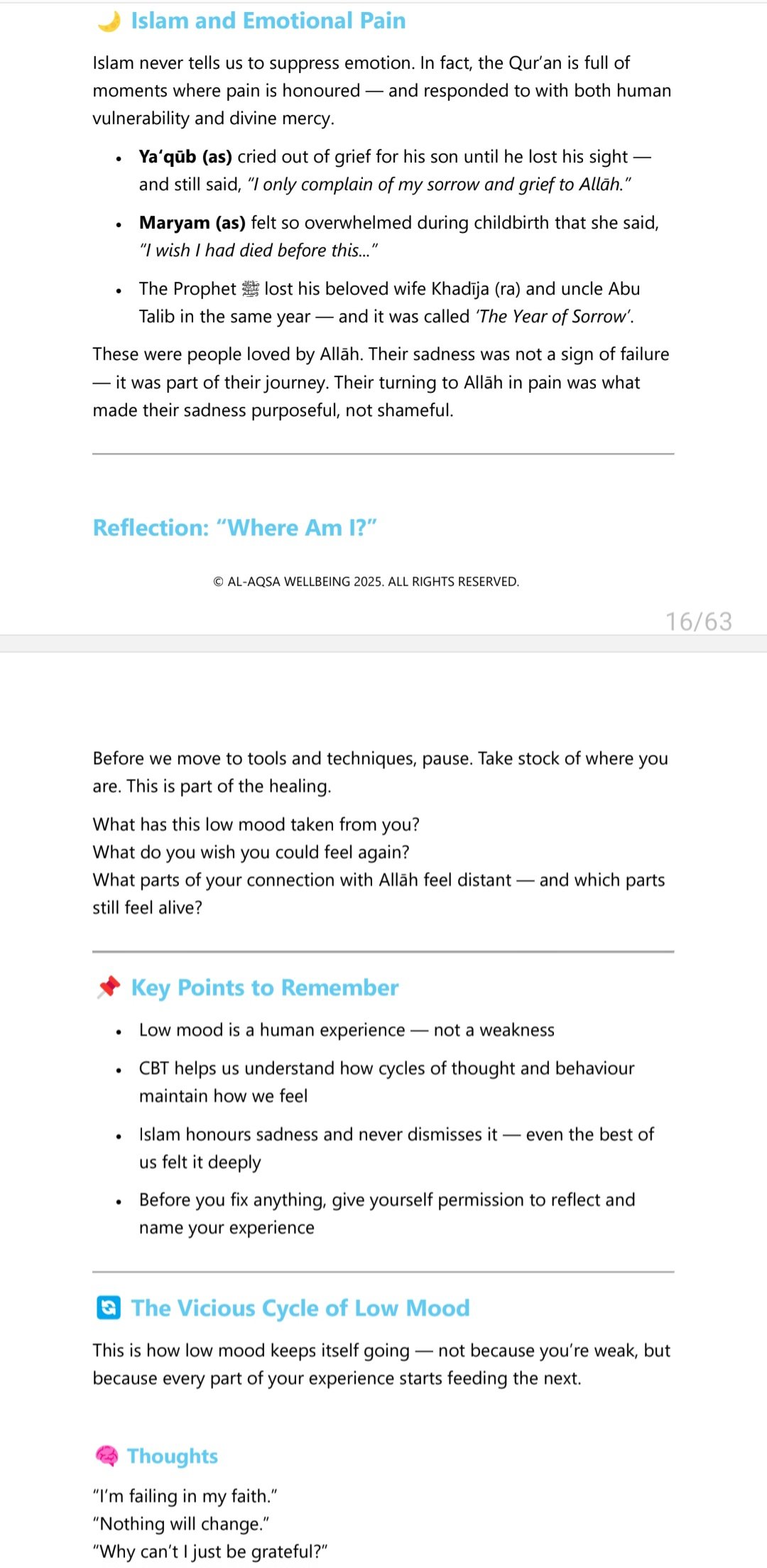 This professionally developed self-help guide is designed for Muslims experiencing symptoms of low mood or depression. It provides a structured, evidence-based approach grounded in Cognitive Behavioural Therapy (CBT) — and Islamic Psychology to support emotional resilience and spiritual wellbeing.